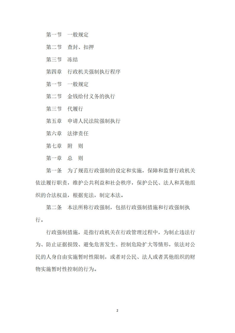 中华人民共和国行政强制法发文单位:全国人民代表大会常务委员会文号:主席令11届第49号效力范围:全文有效发文日期:2011-06-30生效日期:2012-01-01《中华人民共和国行政强制法》已由中华人民共和国第十一届全国人民代表大会常务委员会第二十一次会议于2011年6月30日通过,现予公布,自2012年1月1日起施行。中华人民共和国主席胡锦涛2011年6月30日中华人民共和国行政强制法(2011年6月30日第十一届全国人民代表大会常务委员会第二十一次会议通过)目录第一章总则第二章行政强制的种类和设定第三章行政强制措施实施程序1