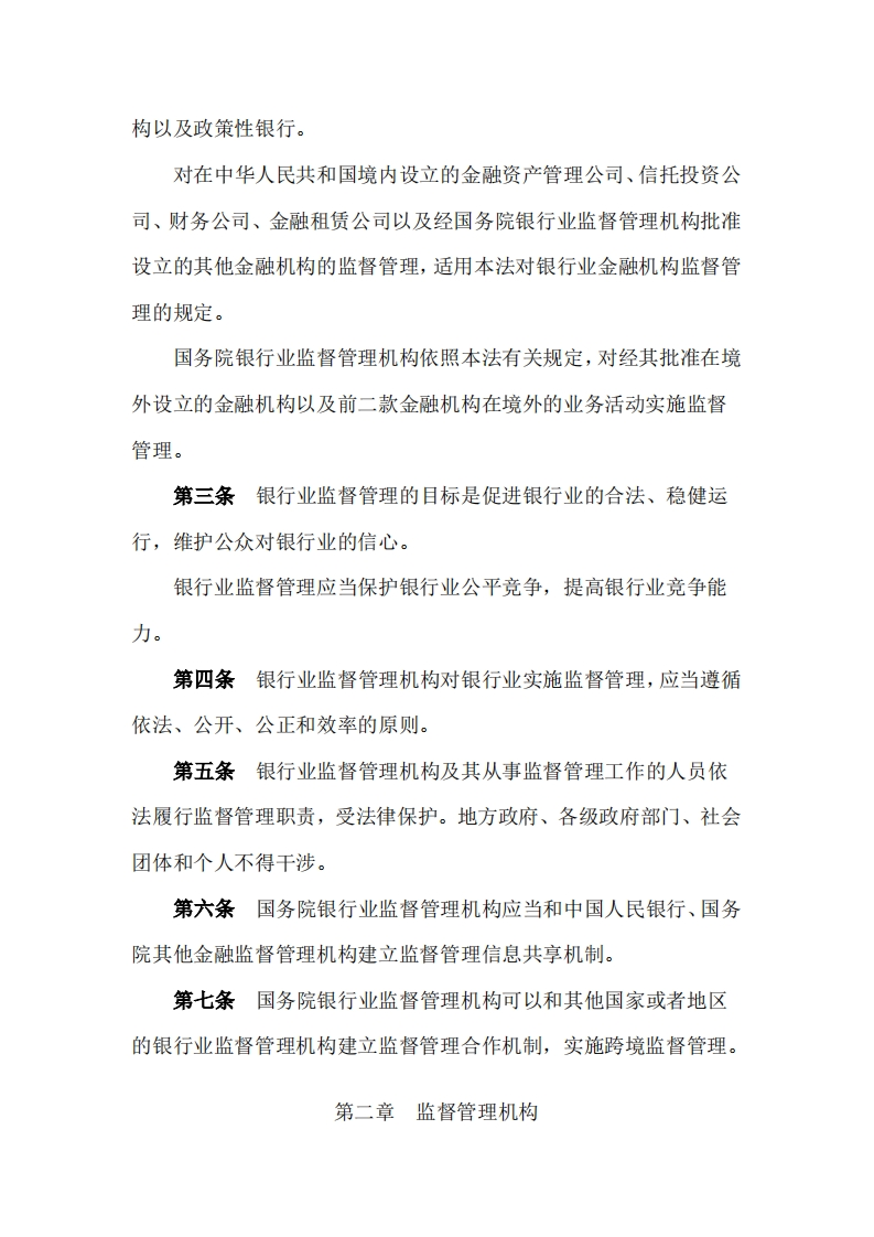 中华人民共和国银行业监督管理法(2003年12月27日第十届全国人民代表大会常务委员会第六次会议通过根据2006年10月31日第十届全国人民代表大会常务委员会第二十四次会议《关于修改〈中华人民共和国银行业监督管理法〉的决定》修正)目录第一章总则第二章监督管理机构第三章监督管理职责第四章监督管理措施第五章法律责任第六章附则第一章总则第一条为了加强对银行业的监督管理,规范监督管理行为,防范和化解银行业风险,保护存款人和其他客户的合法权益,促进银行业健康发展,制定本法。第二条国务院银行业监督管理机构负责对全国银行业金融机构及其业务活动监督管理的工作。本法所称银行业金融机构,是指在中华人民共和国境内设立的商业银行、城市信用合作社、农村信用合作社等吸收公众存款的金融机