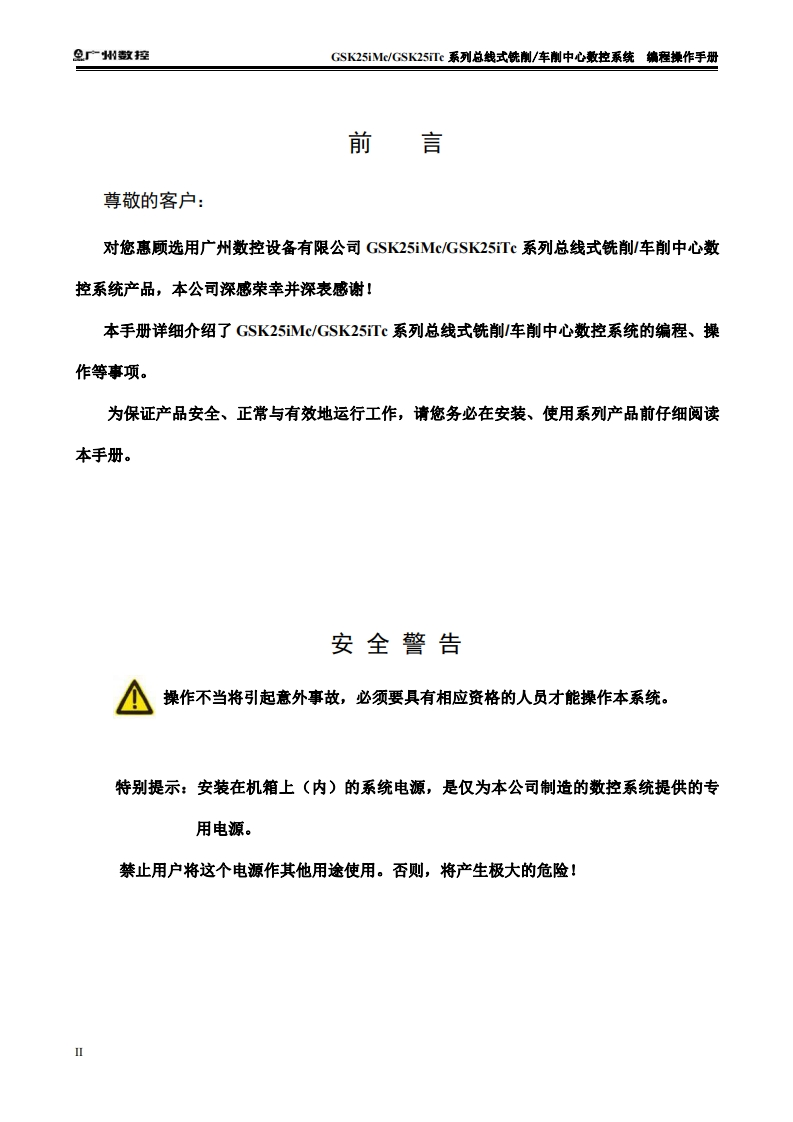 米在本使用手册中,我们将尽力叙述各种与GSK25 iMc/GSK25iTc系列总线式铁削/车削中心数控系统操作相关的事项。限于篇幅限制及产品具体使用等原因,不可能对数控系统中所有不必做和/或不能做的操作进行详细的叙述。因此,本使用手册中没有特别指明的事项均视为“不可能”或“不允许”进行的操作。半本使用手册的版权,归广州数控设备有限公司所有,任何单位与个人进行出版或复印均属于非法行为,广州数控设备有限公司将保留追究其法律责任的权利。