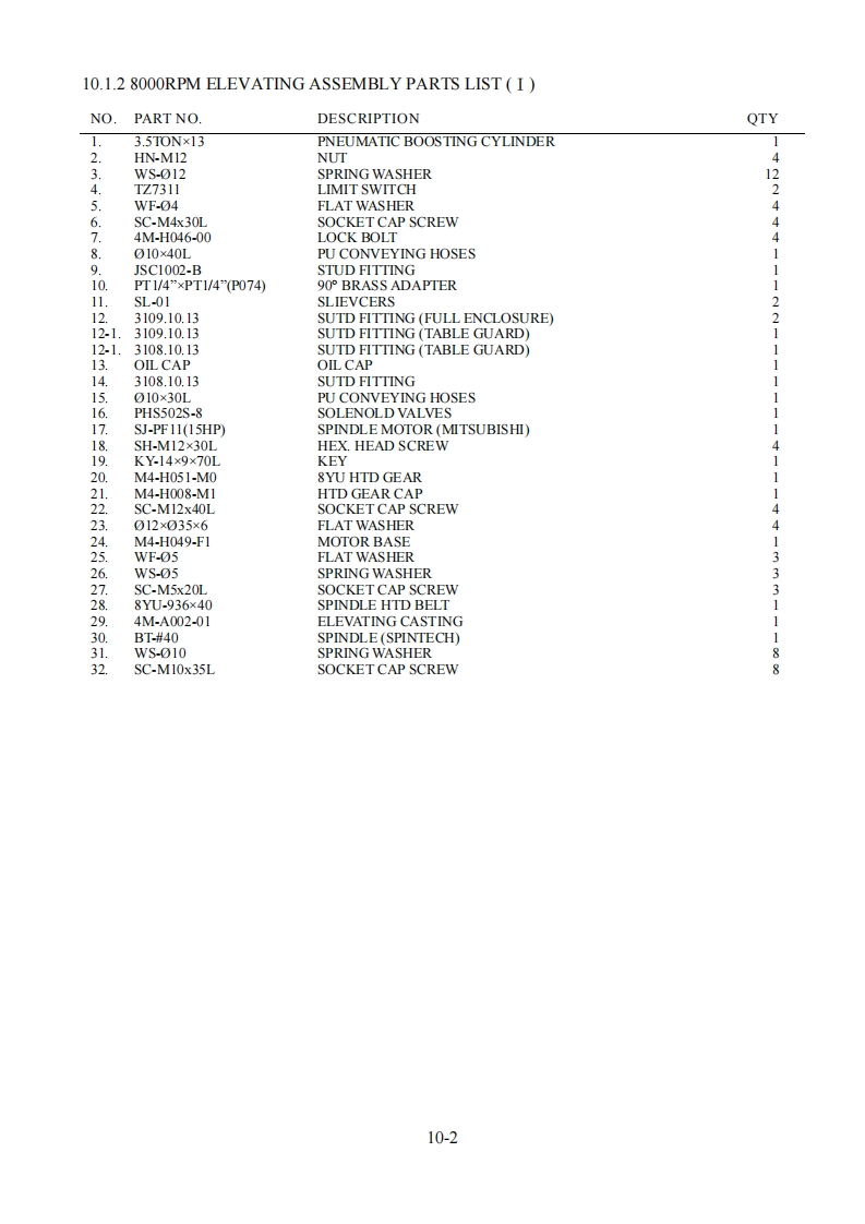 M422partsist安装调试说明书手册348072@abc4个月前发布关注私信1.72MB44页040M422partsist安装调试说明书手册此内容为付费资源,请付费后查看¥17¥25黄金会员免费钻石会员免费立即购买您当前未登录!建议登陆后购买,可保存购买订单付费资源 第1页 / 共44页 第2页 / 共44页 试读已结束,还剩42页,您可下载完整版后进行离线阅读 THE END说明书手册 文本预览 10.PART LISTS10.1 8000RPM ELEVATING ASSEMBLY (I)10.1.1 ELEVATING ASSEMBLY DRAWING⑦⑧19202132514261522272828122416928ILh30313210-1 查看更多 收起部分 喜欢就支持一下吧收藏