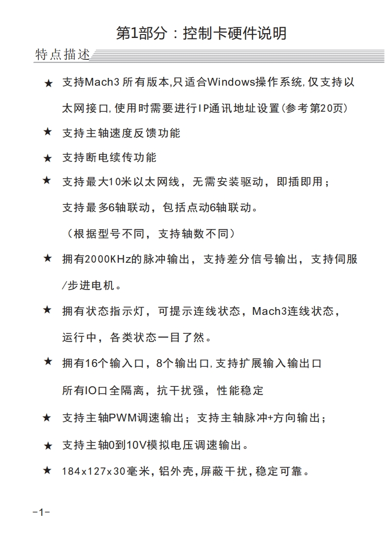 W HcR适合系统:MACH3运动控制系统MACH3以太网控制卡MKX-ET(以太网卡)说明书60665551自1百间留目目留程InPut-IO:In0-In7InPut-IO:In8-In1524V-Power-OutSpindle Control输入端口0到7输入端口8到1524V电源输出主拍控制储口产品名移:Mah3太网控制卡产品型号:MK4ET适合系统:Mch3系统W)Hc硬件程序版本:QC:012016-9-13ETHERNET MOTION CARD电源入电源输出输出口3-8X轴Y轴Z轴A轴Out-Put电源OV电源24VPoMer-inp■-0tK-axIsY-axisA-axis”86●●●●●●●●●●●以太网卡:184x127x30mmMK3-ET:以太网接口的,3轴运动控制卡型号MK4-ET:以太网接口的,4轴运动控制卡MK6-ET:以太网接口的,6轴运动控制卡