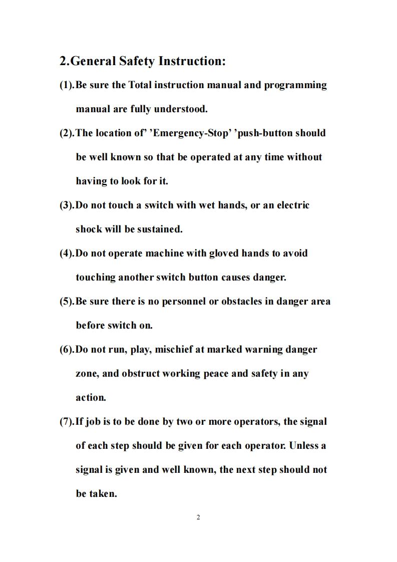 1.Safety Precautions:(1).This machine is designed as a Machining Center ormetal cutting,never try to use this machine out oforiginal limits,If there is any problem,contact to theagency or our company,please.(2).This machine provides with a number of safetydevices to protect personnel and equipmentfrom injury and damage.Operators should not,however,rely solely upon these safety devicesbut should operate the machine after fullyunderstanding what special precautions to takeby reading the following remarks thoroughly.1