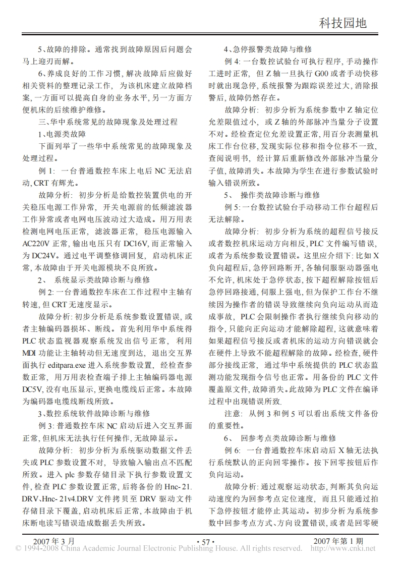 科技园地华中世纪星系统数控机床典型故障排除的方法探析谢培元(乌鲁木齐铁路运输学校,乌鲁木齐830011)摘要:数控机床在使用中难免出现故障,针对华中世机构推广华中数控系统的过程中,可以培养出我纪星系统数控机床,介绍机床某些典型故障诊断与排除的国自己的高素质数控维修技术人员,也同时鞭策方法与经验。我们去创造出一个大环境让更多的新鲜血液注入关键词:华中世纪星数控系统:数控机床常见故障:故较深层次的数控技术研发领域,这对发展民族数障诊断与排除控产业,缩短和发达国家技术水平差距,提高我国一、前言机械加工水平,甚至增强国力,意义都非比寻常。20世纪80年代开始,在我国改革开放大局势数控机床作为机电一体化高度复杂设备,在下,国内数控技术、系统得到迅猛发展,各种国产使用过程中难免出现故障,如果不能及时地做出数控系统林林总总,其中武汉华中科技大学下属正确的判断和排除,将制约机床的使用率,并影响华中数控股份有限公司开发的华中世纪星系列学校正常的实习和生产。本人两年来在学校数控HNC21型数控系统,以其高性能、低价位并具有车间担任机床维护维修工作,针对华中世纪星自主知识产权的特点,得到国家的高度重视,并作HNC21型系统机床的常见典型故障,总结出一些为数控技术专业人员培训的指定系统在全国范围经验体会,以供从事本专业的同行参考交流。内推广。二、故障处理的思路目前在我国数控系统市场占很大份额的主流不同数控系统设计思想千差万异,但无论那国外数控系统生产厂家如德国SIMENS和日本种系统,它们的基本原理和构成都是十分相似的。FANUC主要采用硬件为基础的NC-Base形式,以因此在机床出现故障时,要求维修人员必须有清发挥他们先进的芯片生产技术优势。鉴于某些原晰的故障处理的思路:因,他们不可能转让其核心技术。同时根据我国的1、调查故障现场,确认故障现象、故障性质,国情,国家不可能投入大量资金用于研发和制造应充分掌握故障信息,做到“多动脑,慎动手”避免相应的NC专用芯片,因此华中世纪星系列转而采故障的扩大化。用了更易于产业起步,而且设计思想更加先进的2、根据所掌握故障信息明确故障的复杂程以PC为数控系统平台的PC-Base形式。随着PC度,并列出故障部位的全部疑点。技术的发展,PC Base作为开放式数控系统,其优3、准备必要的技术资料,比如机床说明书,电秀的交互性和可开发性已经体现出极大的优势,气控制原理图等,以此为基础分析故障原因,制定势必成为今后数控系统发展的方向。不可否认,同排除故障的方案,要求思路开阔,不应将故障局限主流数控系统相比,世纪星系统目前还有许多不于机床的某一部分。足,例如:由于PLC和系统共用CPU、扫描系统程4、在确定故障排除方案后,利用示万用表、示序时间长造成机床动态响应性能降低,系统无故波器等测量工具,用试验的方法验证并检测故障,障运行时间短,插补功能较少,故障自诊断功能贫逐级定位故障部位,确认出故障属于电气故障还乏等,但华中世纪星系统拥有自主知识产权及其是机械故障,是系统性的还是随机性的,是自身故开放性特点的事实使我们在职业学校、各种培训障还是外部故障等等。2007年第1期·56·2007年3月1994-2008 China Academic Journal Electronic Publishing House.All rights reserved.http://www.cnki.net