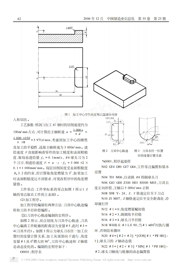 智能控制技术·徐夏民刘晓明华中数控系统用户宏程序在数控技能大赛中的应用华中数控系统用户宏程序在数控技能大赛中的应用徐夏民,刘晓明(江苏联合职业技术学院无锡机电分院,江苏无锡214028)摘要:在全国数控技能大赛中,用户宏程序的编制是实操技能竞赛中的考核重点之一,是参赛选手夺冠争金的关键技术。在数控技能大赛中轮廓倒角和倒圆角的宏程序编制方法有两种:刀具中心轨迹编程和刀具半径补偿编程。通过大赛实例研究两种方法的关键编程技术,通过比较得出结论:使用可编程刀具“半径”变量编制宏程序的方法比较简便编程效率高,且不易出错。关键词:用户宏程序;数控技能大赛;刀具中心轨迹;刀具半径补偿中图分类号:TG659;TG66文献标识码:A文章编号:1672-1616(2006)23-0041-04数控加工程序的编制方法一般有手工编程和选手夺冠争金的尖刀利器。华中数控系统可靠性自动编程两种。随着CAD/CAM软件的不断普高、功能强大、操作简便,为国产数控系统争了光。及,数控程序的编制逐渐由自动编程取代手工编下面以国产数控铣削系统HNC·21M为例,介程。目前,几乎所有零件的数控加工程序都可使吊绍用户宏程序在数控技能大赛中的编程技巧。CAD/CAM软件进行自动编程获得,自动编程其有可靠、简便和不易出错的优点,特别适用于几何形1宏程序的概念状复杂的曲面零件的编程。然而,对于几何形状不使用变量编制可进行算术或逻辑运算,并能控太复杂的零件,手工编程经济、快捷、简便,不受计制程序段流向的程序,称为用户宏程序。使用用户算机和CAM软件的约束,又能和数控系统的功能宏程序可方便地实现二次曲线(椭圆、抛物线等的灵活结合,因而手工编程在某些场合应用广泛。二维编程加工、孔口倒角和倒圆角的二轴半编程加在全国数控技能大赛中,根据竞赛文件的规工、内外形轮廓倒角和倒圆角的二轴半编程加工定,实操技能竞赛只能采用手工编程,不得使用等,可简化程序,提高编程效率,最大限度地发挥手CAM软件自动编程。再者,学生组的竞赛标准按工编程的优势。最新国家职业标准高级工的要求,教师组和职工组的竞赛标准按技师的要求。根据国家职业标准《数2宏程序在数控技能大赛中的应用控铣工》和《加工中心操作工》高级工以上等级的规定,用户宏程序的编制也是手工编程中必须掌握的实例技术。数控技能竞赛的实操试题有一定的难度和a.第一届全国数控技能大赛加工中心学生组较大的工作量,其中轮廓倒角和倒圆角的编程等二的实操技能实例。轴半加工内容,如不采用宏程序编程模式,要完成加工内容:凸台三边倒圆角R3,如图1所示。这部分加工是非常困难的。因此,在数控技能大赛(1)工艺分析。中正确熟练使用变量手工编制宏程序显得尤为重加工顺序:先粗精加工凸台三边轮廓,然后编要。程加工倒圆角R3。在2006年第二届全国数控技能大赛的全国决刀具选择:可供选择的刀具有Φ12钨钢立铣赛中,仍采用3大数控系统:西门子(SIEMENS)、刀和R4钨钢球头刀。考虑到竞赛时间紧和工件的发那科(FANUC)和华中数控(HNC)系统。其中加工表面质量(Ra3.2)要求比较高,宜选用R4钨华中数控系统是惟一的国产数控系统,在2004年钢球头刀,并以球头刀的最底部为刀位点。第一届全国数控技能大赛各省选拔赛和全国决赛铣削方式:为保证加工表面质量,提高刀具的中,华中数控系统表现非常出色,真正成为了参赛耐用度,宜采用顺铣加工,并以轮廓的切线方向切收稿日期:2006-11-09作者简介:徐夏民(164-),男,江苏无锡人,江苏联合职业技术学院无锡机电分院高级技师,主要研究方向为数控技术和CAD/CAM技术,1994-2008 China Academic Journal Electronic Publishing House.All rights reserved.http://www.cnki.net