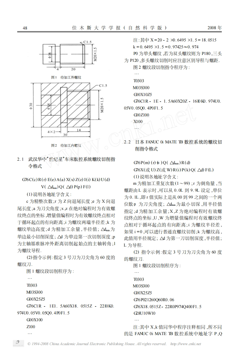 第26卷第1期佳木斯大学学报(自然科学版)Vol.266.12008年01月Journal of Jiamusi University (Natural Science Edition)Jan.2008文章编号:1008-1402(2008)01-0047-03“华中”与“℉ANUC”数控系统“G76”指令使用的异同韩明辉,卢伟2,刘春山2(1.黑龙江农业职业技术学院,黑龙江佳木斯154002;2.佳木斯大学,黑龙江佳木斯154007)摘要:以编程示例的方式,对国产的武汉“华中”数控系统与日本“FANUC数控系统的螺纹切削复合循环指令G76进行对比,明确二者之间的区别与联系,避免使用时出现错误关键词:华中数控系统;FNUC数控系统;螺纹切削复合循环指令G76;编程示例中图分类号:TG519.1文献标识码:A随着我国社会主义市场经济和现代制造技术①外螺纹实际大径计算公式为:的迅速发展,社会及企业对技能人才的知识与技能D室=D-0.2165×P结构提出了更新、更高的要求,数控技术和设备也②内螺纹实际小径计算公式为:在与时俱进,这些都对学习和学握数控技术应用知D实=D·1.299×P识的人提出了挑战.其中,D为公称大径;P为螺距尽管国内外有许多生产数控系统的厂家,但我(4)常用螺纹切削的进给次数与背吃刀量见国目前常用的是以下两种:一是国内教育系统大力表1,其中背吃刀量为直径量.推广的汉字化功能强大的武汉华中数控系统;二(5)单边牙深计算公式:牙深=0.6495×P是高品质高可靠性、高性价比的日本FANUC数控系统.预计在今后很长一段时间内这二种数控系统2举例说明各系统螺纹切削复合循会在工厂中共存,这就要求学校在培养学生的时环指令的使用区别候,既要教他们华中系统又要教他们FANUC系统的编程方法假定如下图所示,图1已经加工到外螺纹实际剖析这两种系统所使用的指令,我们会发现,大径,图2已经加工到内螺纹实际小径,现根据不它们之间尽管有区别,但也有许多相似之处,正是同的系统要求写出该图螺纹段切削程序这种似是而非的表象,往往使用户混淆二者,致使表1常用螺纹切削的进给次数与背吃刀量所编程序中出现错误,尤其值得提出的是螺纹切削公制螺纹m复合循环指令G6,地址相对繁多,更容易出现这螺距1.01.52.02.53.03.54.0种现象牙深0.6490.9741.291.6241.9492.2732.598为此,现将武汉华中数控系统与日本FANUC背10.70.80.91.01.21.51.50i MATE TB数控系统的螺纹切削复合循环指令的吃20.40.60.60.70.70.70.8区别与联系作如下对比:量30.20.40.60.60.60.60.6及40.160.40.40.40.60.61使用每个数控系统螺纹加工指令切50.10.40.40.40.4之前都应明确的相关工艺知识削60.150.40.40.4次70.20.20.4(1)保证适当螺纹切削导入长度与切出长度数80.150.3(2)选择合理的主轴转速90.2(3)保证螺纹毛坯面加工到螺影纹实际大径(小径)①收稿日期:2007-12-20作著简芥:韩明辉(1974.),男黑龙江佳木斯人黑龙江农业职业技术学院工程师,在读硕土。C 1994-2008 China Academic Journal Electronic Publishing House.All rights reserved.http://www.cnki.net