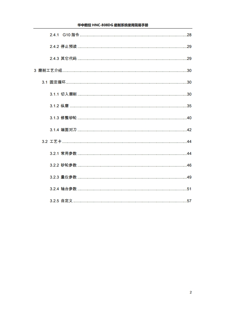华中数控HNC-808DG磨削系统使用简易手册HNC-808DG简易调试手册目录HNC-808DG简易调试手册..11HNC-808DG磨削系统功能介绍32调试步骤2.1总线连接.42.2参数调试.2.2.1NC参数…52.2.2机床用户参数.…62.2.3通道参数..102.2.4坐标轴参数…..152.2.5设备接口参数19.232.3PLC调试.….………………………………….….232.3.1PLC开关文件….232.3.2PLC引用的其它P参数.242.3.3常用PLC模块说明..242.3.4PLC点位.262.3.5M代码..272.4常用的G代码指合.281