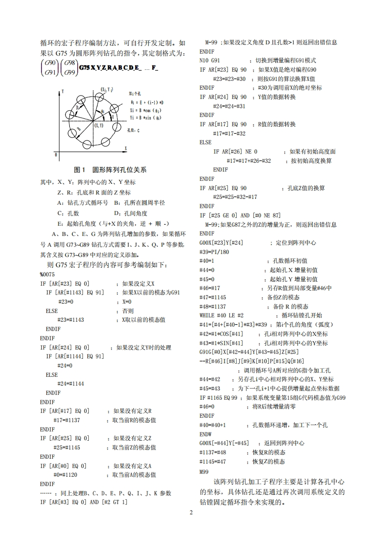 数控编程指令功能扩展的宏实现詹华西李艳华(武汉职业技术学院,武汉430073)[摘要]:基于HNC系统的宏编程处理经验,以一个固定循环指令实现阵列孔加工为例,介绍了数控编程指令功能扩展的二次开发技术,关键词:宏编程:阵列钻孔:二次开发the Macro Technology to Extend NC Programming Instruction FunctionZHAN Hua-xi,LI Yan-hua(Wuhan Institute of Technology,Wuhan 430073,China)[Abstract]:Based on the processing experience of macro programming in HNC system,this articleintroduced redevelopment technology of NC programming instruction function.It even givesexample of a fixed instruction to machine arrayed drills.Key Words:Macro programming:Machining arrayed drills:Secondary development0.引言系统宏AR知来判别该变量是否被定义、是被定义为增量坐标还是绝对坐标方式。由于数控机床进行插补控制的主要是直线和圆弧,系统能提供的直接用于加工的程序指令非调用格式为:AR#变量号]返回值:常有限,因此寻求合理的算法,利用基本指令来扩展系统的编程指令功能,使得用户仅用一个指0:表示该变量没有被定义:90:表示该变量被定义为绝对方式G90:令行即可实现相对复杂的加工功能,这一直是系91:表示该变量被定义为增量方式G91。统开发人员的研究课题,也是加工编程人员寻求例如:IF[AR[23]EQ0]的目标。车削循环、钻镗基本循环等都是数控系IF[AR[#1143]EQ91]统开发人员对指令系统扩展的典型示例,但不同#23=0的系统在这方面开发的程度是有差异的。比如ELSESIEMENS系统已经具有直接用于阵列孔加工、规#23=#1143则形状的挖槽循环等扩展指令,而HNC、FANUCENDIF系统目前还没有面向普通用户提供。对于非开放ENDIF式的数控系统,这种指令功能扩展只能依赖于系表达的意思是:如果指令行的X(对应#23)统生产厂家,对于HNC这类基于PCNC的开放参数未指定,且系统变量#1143(X坐标以前的模式数控系统,只要熟知宏编程处理技术,普通用户即可自行开发定制。态)为增量方式,X就取增量0值:若#1143为绝对方式,X就取以前的模态值。1,宏扩展编程的技术基础HNC作为一个开放式数控系统,其用于钻镗HNC系统在调用宏子程序的同时可进行参数基本循环G73G89的宏扩展程序的源码已面向传值山,即将调用行所跟的主调参数A~Z各字段大用户公开,它就是利用宏子程序参数传值的处的内容拷贝到宏执行的子程序内为局部变量理方法,将G指令定制的多个参数,传值到宏子程序中,由子程序对各参数数据进行整理后依据0~#25预设的存贮空间中:将指令的初始平面Z的模态值拷贝到#26中:同时还拷贝当前通道九个相应的加工工艺,按一定的算法通过基本指令来轴(XYZ/ABC/UVW)的绝对位置坐标到宏子程定制动作实现加工。普通用户亦可参照这一思路序的局部变量#30~#38中:并且还可以通过系统变进行编程指令的二次开发。量#1120#1145来访问A~Z26个地址字的模态数2.阵列钻孔扩展指令的开发定制据,通过系统变量#1150~#1169来访问0~19组G图1所示为一圆形阵列孔位关系分布图。和代码的模态值。在HNC系统中,对于每个局部变量,都可用矩形阵列孔加工一样,在HNC中目前还无法由一个指令行来编程实现,但参照G73G89钻撞基本