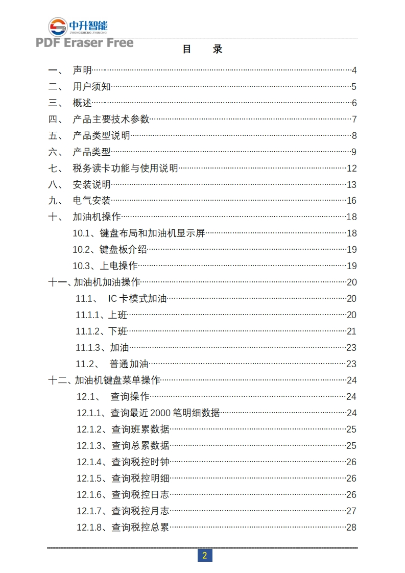○中升智能PDF Eraser Free欢迎您使用中升智能Z$系列燃油加油机真诚欢迎您使用中升智能Z$系列燃油加油机.请您在使用之前,务必要充分阅读本说明书。本说明书对中升智能ZS系列燃油加油机的适用范围、结构原理、功能特性介绍、运用等做了全面的说明,并简明介绍了正确使用、操作、安装、维护和保养的方法。如果您在使用过程中遇到什么问题,请就近拨打安徽中升智能科技有限公司驻各地代理商服务电话或本公司售后服务热线,我们将竭诚为您提供优质、快捷、热情和高效的服务。谢谢您的合作与支持!安徽中升智能科技有限公司1