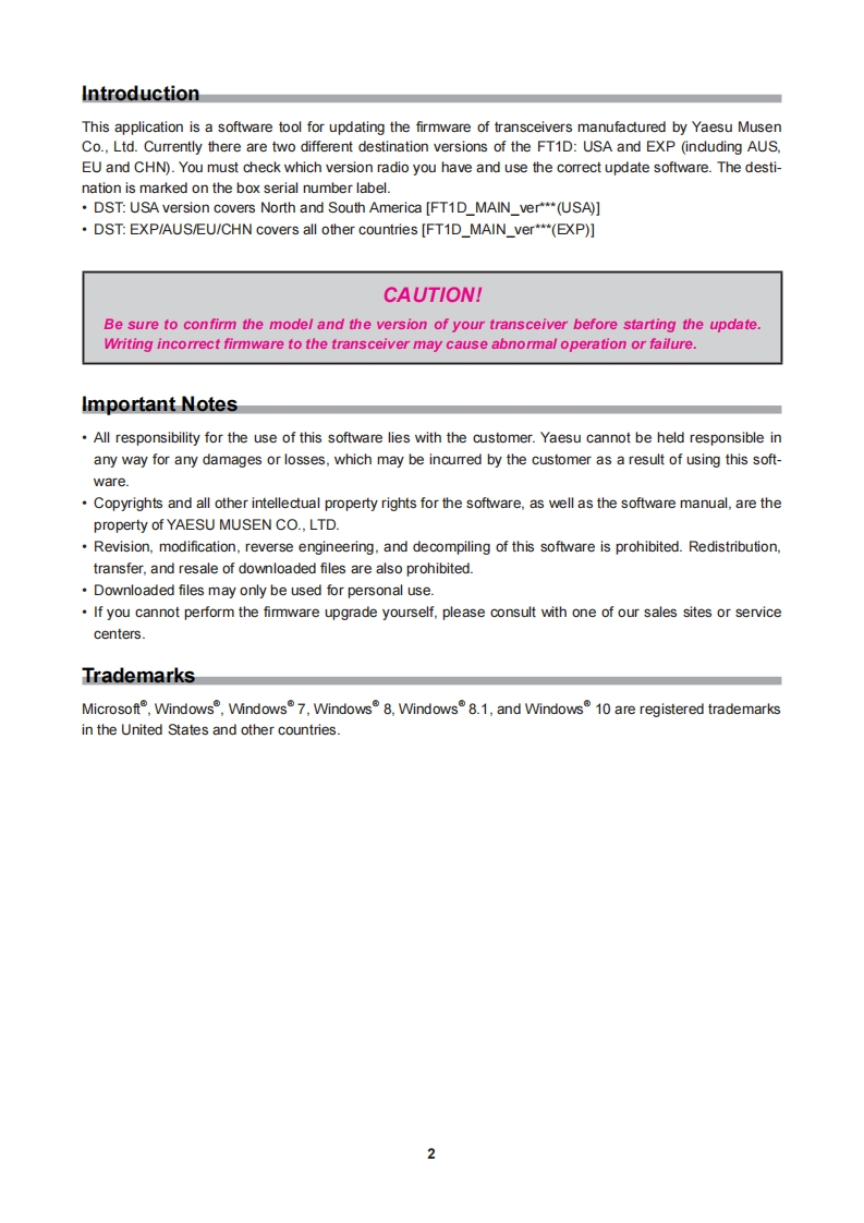 YAESUThe radioFTDR/DEMain FirmwareUpdate Instruction Manual(This firmware is not compatible with the FT1XDR/DE)CautionPlease be sure to confirm the model and the version of yourtransceiver before starting the update.Writing incorrect firm-ware to the transceiver may cause abnormal operation or fail-ure.Do not install this version firmware to any FT1XDR/DE.The update firmware is NOT compatible between FT1DR/DEand FT1XDR/DE.YAESU MUSEN CO.,LTD.