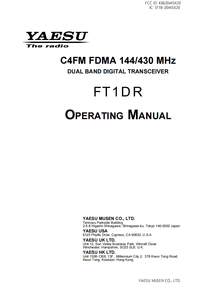 FCC ID:K6620445X201C:511B-20445X20YAESUThe radioC4FM FDMA 144/430 MHzDUAL BAND DIGITAL TRANSCEIVERFT1DROPERATING MANUALYAESU MUSEN CO.,LTD.Tennozu Parkside Building2-5-8 Higashi-Shinagawa,Shinagawa-ku,Tokyo 140-0002 JapanYAESU USA6125 Phyllis Drive,Cypress,CA 90630,U.S.AYAESU UK LTD.Unit 12,Sun Valley Business Park,Winnall CloseWinchester,Hampshire,S023 OLB.U.K.YAESU HK LTD.Unit 1306-1308,13F.,Millennium City 2,378 Kwun Tong Road,Kwun Tong,Kowloon,Hong KongYAESU MUSEN CO.,LTD.
