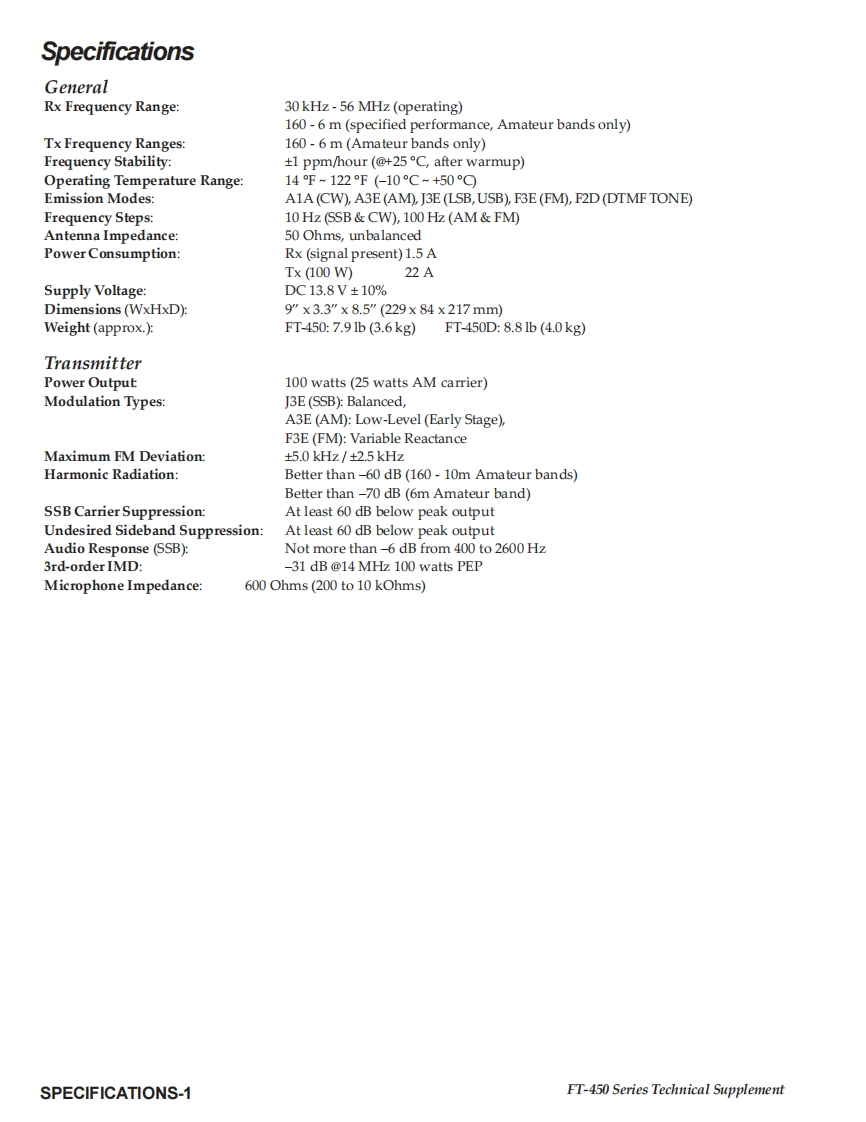 YAESUVERTEX STANDARD CO.,LTD.4-8-8 Nakameguro,Meguro-Ku,Tokyo 153-8644,JapanVERTEX STANDARDHF/50MHZ TRANSCEIVERUS Headquarters10900 Walker Street,Cypress.CA 90630.U.S.A.YAESU UK LTD.FT-450/DUnit 12.Sun Valley Business Park,Winnall CloseWinchester,Hampshire,SO230LB,U.K.VERTEX STANDARD HK LTD.Technical SupplementUnit 5,20/F.,Seaview Centre,139-141 Hoi Bun Road,Kwun Tong,Kowloon,Hong KongVERTEX STANDARD(AUSTRALIA)PTY.,LTD.Normanby Business Park,Unit 14/45 Nomanby RoadNotting Hill 3168.Victoria.Australia2011 VERTEXSTANDARD CO.,LTD.EH024H90DIntroductionThis manual provides technical information necessaryfor servicing the FT-450/D HF/50 MHz Transceiver.Servicing this equipment requires expertise in handling sur-face-mount chip components.Attempts by non-qualified per-sons to service this equipment may result in permanentdamage not covered by the warranty,and may be illegal in2l295.00F0-Asome countries.Two PCB layout diagrams are provided for each double-sided circuit board in the Transceiver.Each side of is re-ferred to by the type of the majority of components in-FT-450stalled on that side ("leaded"or "chip-only").In mostcases one side has only chip components,and the otherhas either a mixture of both chip and leaded components(trimmers,coils,electrolytic capacitors,ICs,etc.),or lead-ed components only.While we believe the technical information in this manu-al to be correct,VERTEX STANDARD assumes no liabili-ty for damage that may occur as a result of typographi-21295.00F8-Acal or other errors that may be present.Your cooperationin pointing out any inconsistencies in the technical infor-mation would be appreciated.FT-450DContentsSpecificationsExploded View Miscellaneous PartsBlock DiagramConnection DiagramAlignmentBoard Unit(Schematics,Layouts Parts)RF-IF UnitPANEL UnitCNTL UnitPA UnitTUNER Unit (FT-450 Option:ATU-450