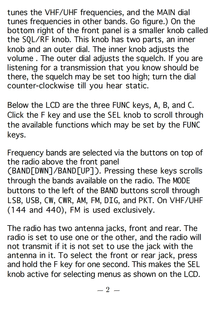 FT-817 Cheat Sheet(There are separate instructions for connecting thetransceiver to power and turning it on."Click"meansto press a button and to release it immediately;"pressand hold"a button means to press it in and hold it for asecond.See the attached photo.)The front panelThe power switch is the button on the far right of thefront panel,upper corner,and it is labeled PWR.To theleft of the power switch is the LOCK key.Pressing thiskey locks the controls,preventing inadvertentfrequency changes.Continuing to the left,next is theV/M key;this key toggles between VF0 and memorymodes.The transmit/busy indicator is next.The lightis green when squelch opens and red whentransmitting.Finally,the last button before the LCD isthe F key.Clicking the F key displays the functionsavailable via the A,B,and C keys.(These keys arebelow the LCD screen.)The button to the left of the LCDis the HOME key;clicking it recalls your "home"frequency.The knob to the left of the LCD is the SEL knob.Depending on the mode the radio is in,turning the SELknob tunes a frequency or selects a memory channel orfunction for the ABC keys.The large dial to the right ofthe LCD is the MAIN dial.This is the main tuning dialfor the radio.(Generally,in VF0 mode the SEL knobDownloaded byl□RadioAmateur.EU