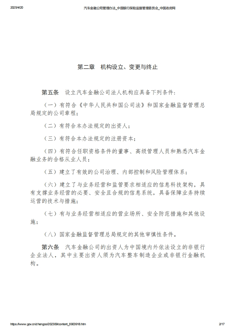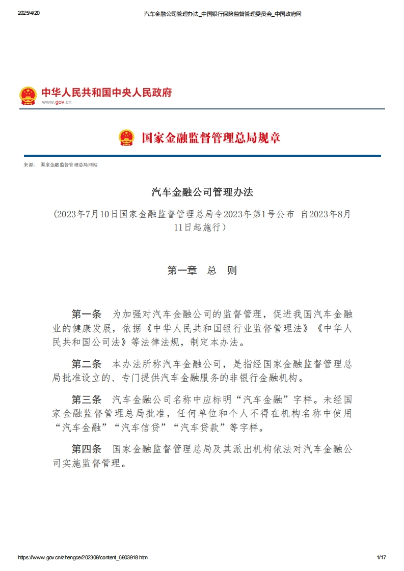 20254W20汽车金融公司管理助法中国银行保险监督管理委员会中国政府网中华人民共和国中央人民政府www.gov.cn国家金融监督管理总局规章米源:国家金融监督管理总局网站汽车金融公司管理办法(2023年7月10日国家金融监督管理总局令2023年第1号公布自2023年8月11日起施行)第一章总则第一条为加强对汽车金融公司的监督管理,促进我国汽车金融业的健康发展,依据《中华人民共和国银行业监督管理法》《中华人民共和国公司法》等法律法规,制定本办法。第二条本办法所称汽车金融公司,是指经国家金融监督管理总局批准设立的、专门提供汽车金融服务的非银行金融机构。第三条汽车金融公司名称中应标明“汽车金融”字样。未经国家金融监督管理总局批准,任何单位和个人不得在机构名称中使用“汽车金融”“汽车信贷”“汽车贷款”等字样。第四条国家金融监督管理总局及其派出机构依法对汽车金融公司实施监督管理。https://www.gov.cn/zhengce/202309/content_6903918.htm1/17