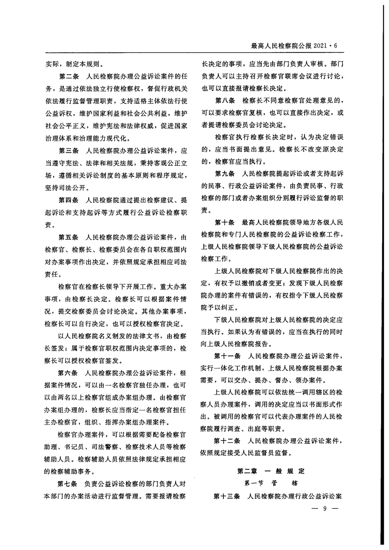 最高人民检察院公报2021·6中华人民共和国最高人民检察院公告《人民检察院公益诉讼办案规则》已经2020年9月28日最高人民检察院第十三届检察委员会第五十二次会议通过,现予公布,自2021年7月1日起施行。最高人民检察院2021年6月29日人民检察院公益诉讼办案规则(2020年9月28日最高人民检寒院第十三届检察委员会第五十二次会议通过,2021年6月29日最高人民检察晓公告公布,自2021年7月1日起施行)高检发释字〔2021)2号第三节提起诉讼目录第四章民事公益诉讼第一章总则第一节立案与调查第二章一般规定第二节公告第一节管辖第三节提起诉讼第二节回避第四节支持起诉第三节立案第五章其他规定第四节调查第六章附则第五节提起诉讼第一章总则第六节出席第一审法庭第七节上诉第一条为了规范人民检察院履行公益诉讼第八节诉讼监督检察职责,加强对国家利益和社会公共利益的保第三章行政公益诉讼护,根据《中华人民共和国人民检察院组织法》第一节立案与调查《中华人民共和国民事诉讼法》《中华人民共和国第二节检察建议行政诉讼法》等法律规定,结合人民检察院工作-8一