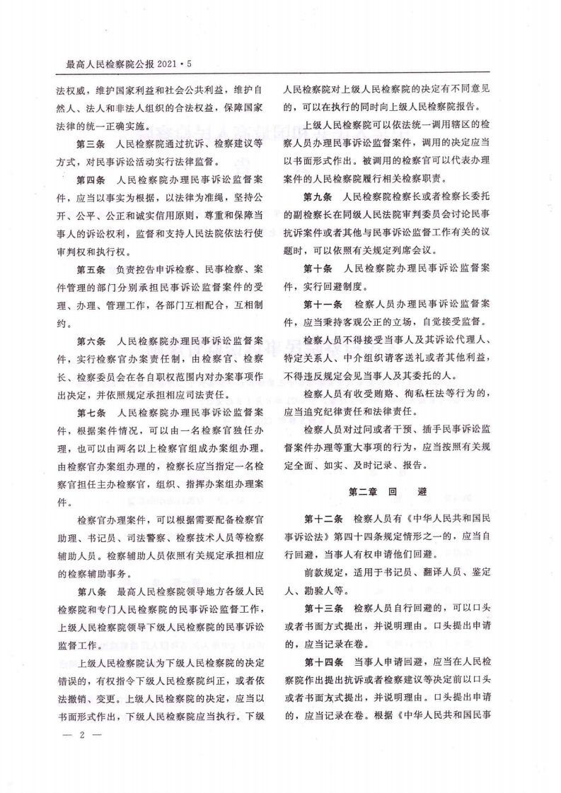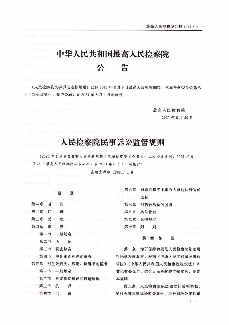 最高人民检察院公报2021·5中华人民共和国最高人民检察院公告《人民检察院民事诉讼监督规则》已经2021年2月9日最高人民检察院第十三届检察委员会第六十二次会议通过,现予公布,自2021年8月1日起施行。最高人民检察院2021年6月26日人民检察院民事诉讼监督规则(2021年2月9日最高人民检察院第十三届检察委员会第六十二次会议通过,2021年6月26日最高人民检察院公告公布,自2021年8月1日起施行)高检发释字〔2021)1号第六章对审判程序中审判人员违法行为的目录监督第一章总则第七章对执行活动的监督第二章回避第八章案件管理第三章受理第九章其他规定第四章审查第十章附则第一节一般规定第一章总则第二节听证第三节调查核实第一条为了保障和规范人民检察院依法履第四节中止审查和终结审查行民事检察职责,根据《中华人民共和国民事诉第五章对生效判决、裁定、调解书的监督讼法》《中华人民共和国人民检察院组织法》和第一节一殷规定其他有关规定,结合人民检察院工作实际,制定第二节再审检察建议和提请抗诉本规则。第三节抗诉第二条人民检察院依法独立行使检察权,第四节出庭通过办理民事诉讼监督案件,维护司法公正和司-1