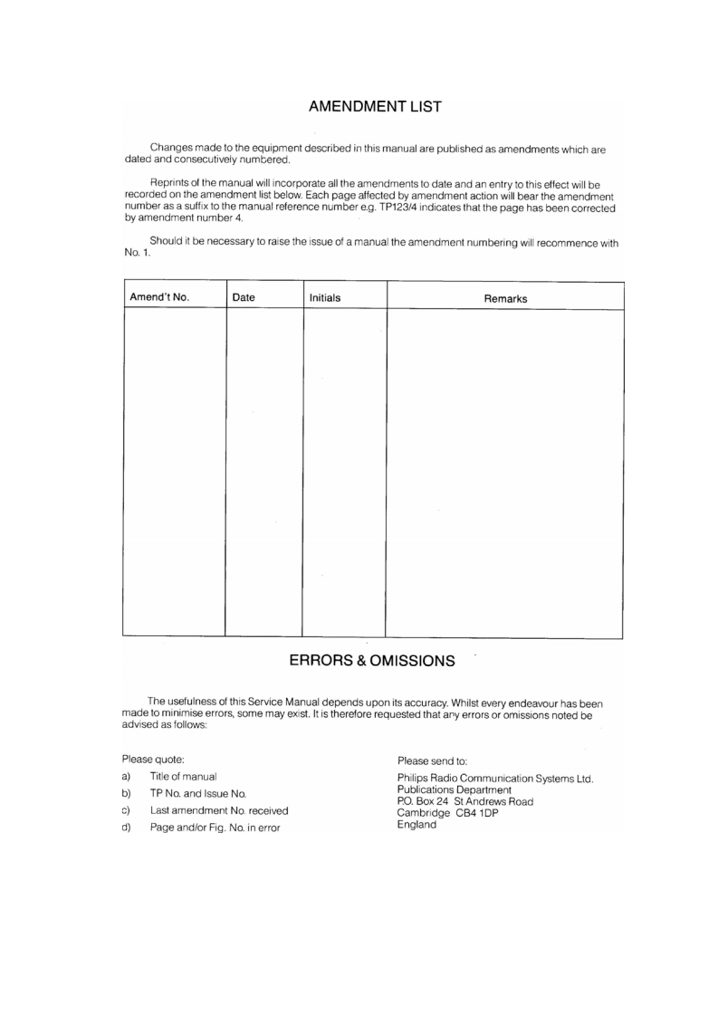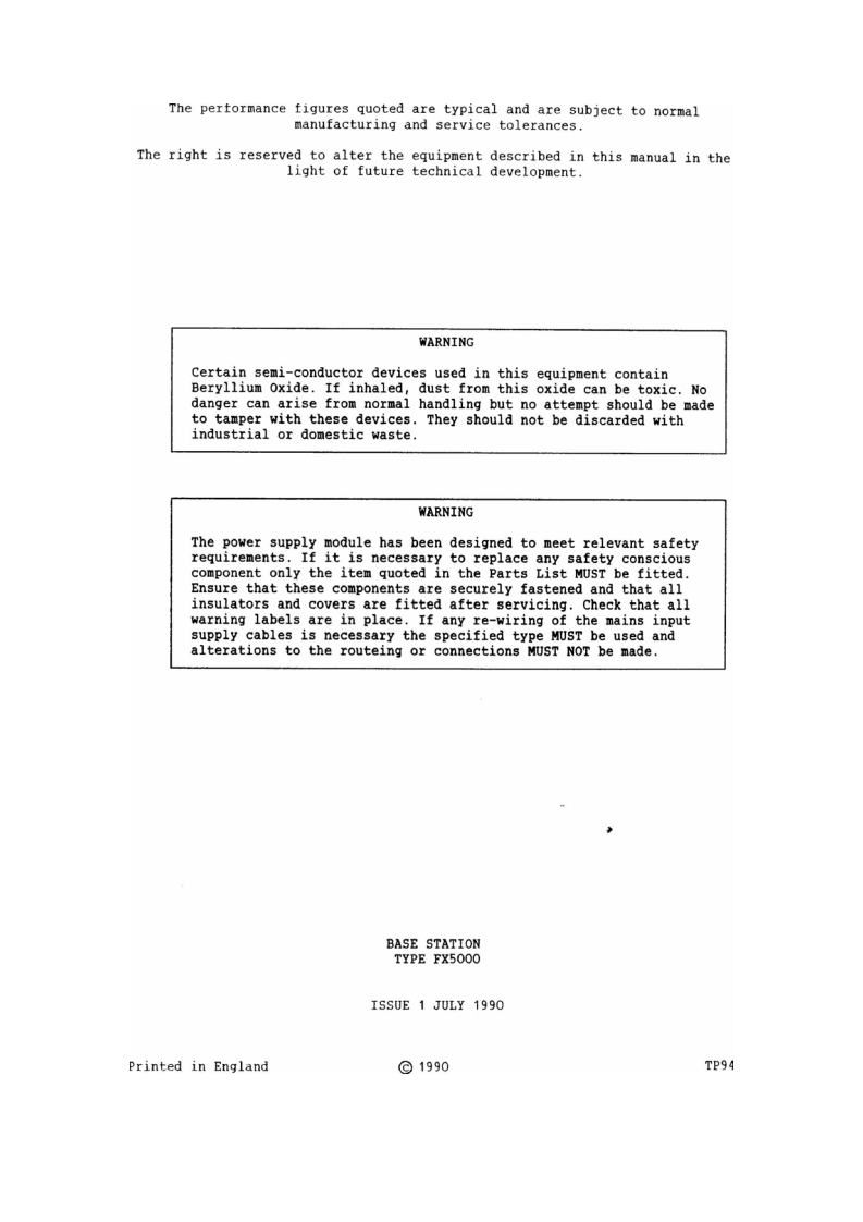 The pertormance figures quoted are typical and are subject to normalmanufacturing and service tolerances.The right is reserved to alter the equipment described in this manual in thelight of future technical development.WARNINGCertain semi-conductor devices used in this equipment containBeryllium oxide.If inhaled,dust from this oxide can be toxic.Nodanger can arise from normal handling but no attempt should be madeto tamper with these devices.They should not be discarded withindustrial or domestic wasteWARNINGThe power supply module has been designed to meet relevant safetyrequirements.If it is necessary to replace any safety consciouscomponent only the item quoted in the Parts List MUST be fitted.Ensure that these components are securely fastened and that allinsulators and covers are fitted after servicing.Check that allwarning labels are in place.If any re-wiring of the mains inputsupply cables is necessary the specified type MUST be used andalterations to the routeing or connections MUST NOT be made.BASE STATIONTYPE FX5000ISSUE 1 JULY 1990Printed in England©1990TP94