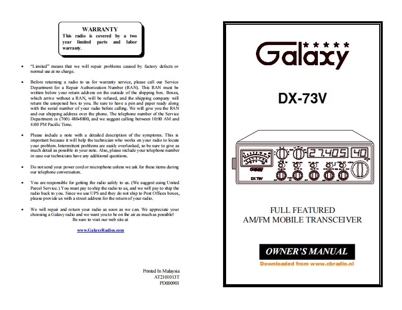 WARRANTYThis radio is covered by a twoyear limited parts and laborwarranty.Galaxy"Limited"means that we will repair problems cased by factory defects ornormal use at no charge.Before returning a radio to us for warrany service,plase call our ServiceDepartment for a Repair Authorization Number (RAN).This RAN must bewritten helow your return address on the outside of the shipping bax.Baxes,which arrive without a RAN,will be refused,and the shipping compary willDX-73Vreturn the unopened box to you.Be sure to have a pen and paper ready alongwith the serial number of your radio before calling.We will give you the RANand our shipping address over the phone.The telephone number of the ServiceDepartment is (760)480-8800,and we suggest calling between 10:00 AM and400 PM Pacific Time.Please indude a not with a detailed description of the symploms.This isimportant becase it will help the technician who works on your radio to lcaleyour problem.Intermittent problems are easily overlooked,so be sure to give asmuch detail as possible in your note.Also,plese include your telephone numberin case our technicians have any additional questions.:E4四4▣Do notsend your power cord or microphone unless we ask for these items during55our telephone conversation.You are responsible for getting the radio safely to us.(We suggest using UnitedParcel Service.)You must pay to ship the radio to us,and we will pay to ship theradio hack to you.Since we use UPS and they do not ship to Post Offices baxes,plase provide us with a street address for the return of'your radio.We will repair and retur your radio as soon as we can.We appreciake yourFULL FEATUREDchoosing a Galxy radio and we want you to be on the air as much as possiblelBe sure o visit our web site atAM/FM MOBILE TRANSCEIVERww.GalaxyR adi低cm▣OWNER'S MANUALDownloaded from www.cbradio.nlPrinted In MalaysiaAT2101013TPD000901