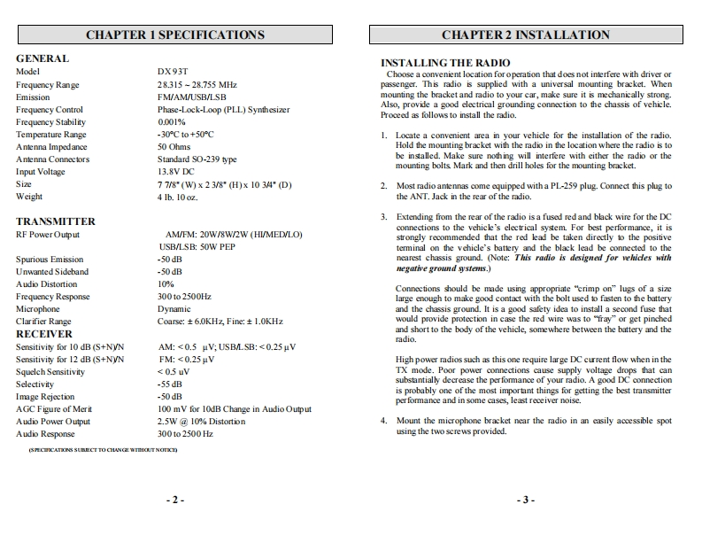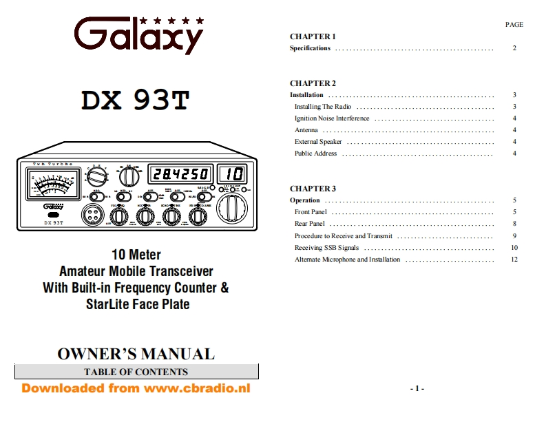 GalaxyPAGECHAPTER 1Specifications .............................................2CHAPTER2DX 93Tstallati0n,,,,,,,,,,,,,,,,,,,,,,,,,,,,,,,,,,,,,3Installing The Radio3Ignition Noise Interference4Antenna....................................External SpeakerPublic Address迹2a4250.6…CHAPTER30 pe ration,.,...,..,5G元Fr0tPel,,,,,,,,,,,,,,,,,,,,,,,,,,5DX 93TRear Panel8Procedure to Receive and Transmit ...........................910 MeterReceiving SSB Signals......................................10Altemate Microphone and Installation .........................2Amateur Mobile TransceiverWith Built-in Frequency CounterStarLite Face PlateOWNER'S MANUALTABLE OF CONTENTSDownloaded from www.cbradio.nl-1-