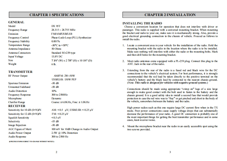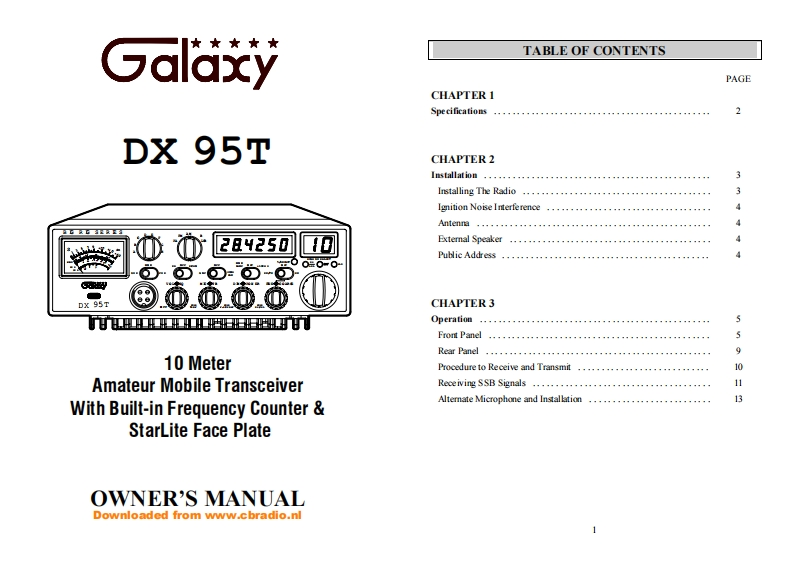 GalaxyTABLE OF CONTENTSPAGECHAPTER 1Specifications2DX 95TCHAPTER 21sl0n…3Installing The Radio ............................3Ignition Noise Interference4Antenna………2a4250Extemal Speaker0=6-0Public Address...........DX 95TCHAPTER 3HHH性店UOperation510 MeterRear Panel ...............................................9Procedure to Receive and Transmit............................10Amateur Mobile TransceiverReceiving SSB Signals .....................................山With Built-in Frequency CounterAlternate Microphone and Installation..........................13StarLite Face PlateOWNER'S MANUALDownloaded from www.cbradio.nl