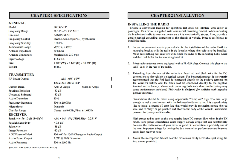 GalaxyTABLE OF CONTENTSPAGECHAPTER 1Specifications ....2DX 98VHPCHAPTER 21slla0n…3Installing The Radio ..............................3Ignition Noise Interference ........................4Antenna日8.日日日旧EExtemnal Speaker,……Public AddressDX 98VHPCHAPTER 3Operation5f0Pan……5810 MeterRean…Procedure to Receive and Transmit ...........................Amateur Mobile TransceiverReceiving SSB Signals.……10Alternale Microphone and Installation .........................12With Built-in Frequency CounterStarLite Face PlateOWNER'S MANUAL