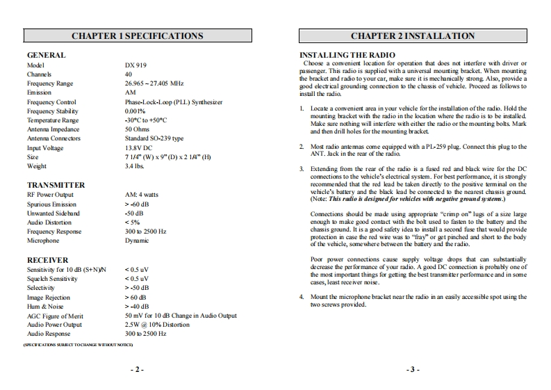 GalaxyTABLE OF CONTENTSPAGECHAPTER 12DX919CHAPTER 21sli0n…stalling The Radio.-,…3Ignition Noise Interference...........................Antenna.......................................Extemal Speaker.,………Public Address,,,……CHAPTER 3Operation5DXFront Panel ................................................5Re……7Frequency0hat…8Procedure to Receive and Transmit .............................9Alternate Microphone and Installation............................10Two WayMaintenance And Adjustment .................................13A Few Rules That Shoul Be Obeyed .................14Citizens Band Mobile Transceiverlow Your CB Can Serve You……14Use Channel 9 For Emergency Message Only......................15OWNERS MANUAL-1-