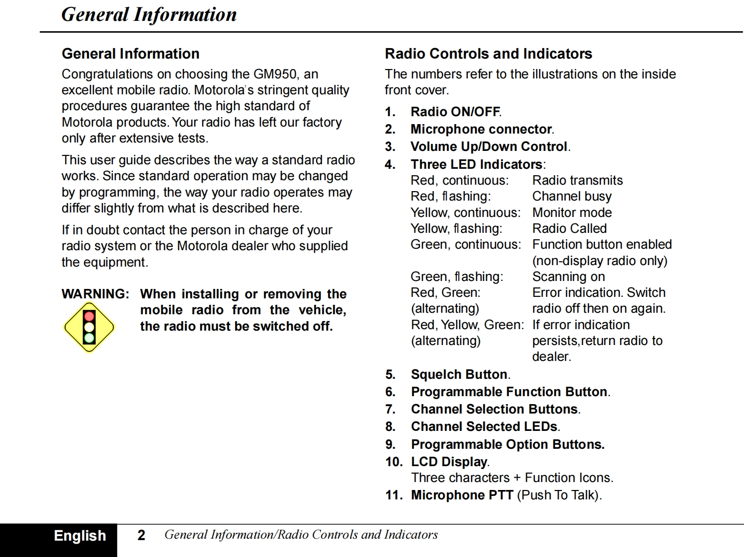 GM950 User GuideGM950Safety InformationUser GuideEvery radio,when transmitting,radiates energy intothe atmosphere which may,under certainContentsconditions,cause the generation of a spark.AllPage:users of vehicles fitted with radios should be awareSafety Information...1of the following warning:General Information.................2WARNING:Do not operate radio nearRadio Controls and Indicators............2inflammable liquids or in theAudio Signals..…3vicinity of explosive devices.Display Icons.…3Radio On/off ..........3During normal use,the radio will subject you toChannel Selection..........................................4radio energy substantially below the level whereany kind of harm is reported.4-Channel Model..…128-Channel Model.To ensure personal safety,please observe theChannel Without Selective Call Functions............following simple rules:4Communication Procedures............................4DO NOT transmit when the antenna is very closeto,or touching,exposed parts of the body,Call Termination.…×especially the face and eyes.Channel With Selective Call Functions.................5DO NOT hold the transmit(PTT)key in when notAddress Selection....................5actually desiring to transmit.Status Selection..DO NOT allow children to play with any radioSending a Selective Call....5equipment containing a transmitter.Receiving a Selective Call...5□DO NOT operate radio whilst driving.It should alsoOption Button Functions........6be noted that the use of a hand-held microphoneComputer Software Copyright ...........................7while driving could constitute an offence underRoad Traffi c Regulations.Contents/Safety InformationEnglish