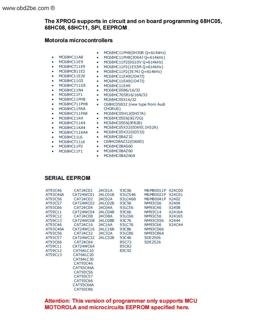 ww.obd2be.com®XPROG ProgrammerUsers ManualUniversal Programmer XPROG allows to program internal EEPROM ofMOTOROLA microcontrollers family MC68HC05xxx,MC68Hc705xxx,MC68HC08xxx,MC68HC11xxx,as well as consequent EEPROM series 24Cxx,25Cxx,64Lxx,93Cxx,95Cxx and similar.Big amount of consequent EEPROM is supported widely used in car audio-andCD players,car computers (instrument panels(DASHBOARD),AIRBAG,immobilizers).All Motorola microcontrollers can be programmed "on-board"(without takingfrom the circuit pack).Operating system:Microsoft Windows 95/98/Me/2000,Windows XP-functioningnot stable.