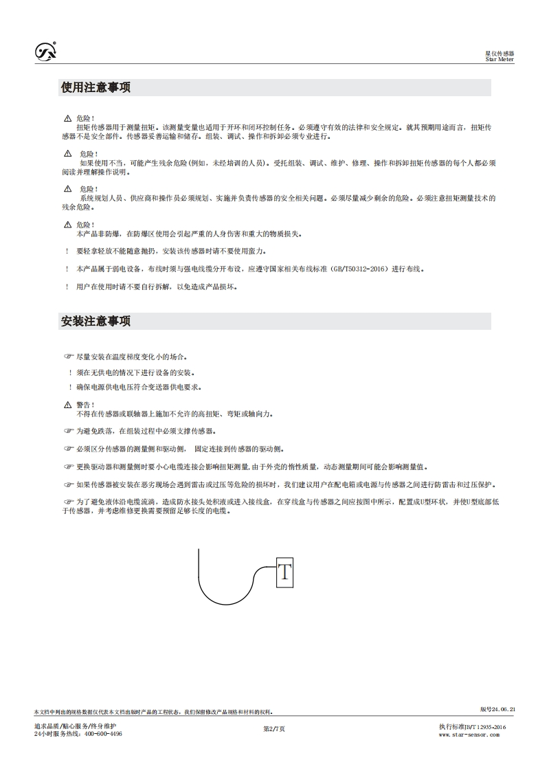 安装说明YBNJ12轴式动态扭矩传感器安全指导术语解释测量侧扭矩传感器的机械连接,要测量的扭矩被引入其中。通常本安装说明包含了如何正确使用该传感器的重要信息。传这一侧的转动惯量最小。感器安装人员在操作该传感器前应认真阅读本操作手册。如遇更深了解或有特殊问题,而本安装说明书未作详细介绍的部分,驱动侧请同本公司联系,以获得必要的信息。扭矩传感器与测量侧相反的机械连接,通常具有更大的转动惯量。请注意手册上的警告标志!扭矩传感器的测量侧标记如下操作人员须严格按照安装说明进行操作。另外,须遵守职测量侧业安全规则,事故预防准则以及国家安装标准和工程规范。请妥善保管本手册,将其存放于本传感器附近便于取阅的位置。轴位移本安装说明的版权受保护。此版本的安装说明是根据印刷时对应产品能够实现的功能编写,尽可能详实完整的描述产品功能和操作步骤。如果您发现错误,欢迎批评指正。对于其中可能出现的错误描述和可能引发的后果,本公司不承担责任。~保留技术参数的修改权一角度位移图标说明轴向位移△危险!·可能会导致死亡或重伤的危险情况。△警告!·可能会导致死亡或重伤的潜在危险情况。径向位移!小心!·可能会导致轻伤的潜在危险情况。c提醒!·可能会导致人身伤害的潜在危险情况。产品说明该传感器用于测量动态扭矩,扭矩传感器的安装位置为水平或提示!一确保设备无故障运行的提示和信息。垂直。开箱标识a)开箱后,按装箱单检查文件和附件是否齐全。扭矩传感器ww.star-sensor.comTe1:400-600-4961装箱文件:安装说明一份。型号:产品合格证一张。接线图品细保修卡一张。扭矩:0数据表一份。输出:供电:口b)当收到产品时请检查包装是否完好,并核对传感器型号和规格是否与您选购的产品相符。制造商:星仪传感器制造有限公司c)观察传感器是否有因运输而产生损坏等现象,以便妥善处理·)望用户妥善保存“保修卡”切勿丢失,否则无法返厂免费维修!本文档中列出的规格数据仅代表本文档出版时产品的工程状老,我们保瘤修政产品规格和材料的权科。版号24.08.21追求品质贴心服务/终身维护第1/7页执行标准B/T12935201624小时服务热线:400600-4496www.star-sensor.com