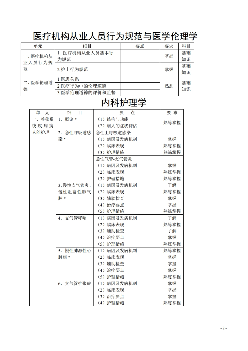 368-373护理学专业(中级)考试大纲说明护理学专业(中级)包括:护理学、内科护理、外科护理、妇产科护理、儿科护理、社区护理六个亚专业。护理学专业(中级)基础知识和相关专业知识考核内容相同:专业知识和专业实践能力根据报考亚专业的不同,所考核的内容不同:其中护理学专业(368)的专业知识和专业实践能力所要考查的内容见大纲中标注“*”部分。专业实践能力主要考核考生的实践技能和临床思维能力,强调知识的综合应用,因此考生应全面复习相关学科内容。护理学专业(中级)考试科目与内容对应关系见表一、二,详细内容请参见考试大纲。表一基础知识、相关专业知识对应关系表科目内容所占比例临床常见病、多发病的病因及内科35%外科35%基础知识发病机制、辅助检查妇产科15%儿科15%护理健康教育学、医院感染护护理健康教育学30%医院感染护理学30%相关专业知识理学、护理管理学、中医护理护理管理学30%中医护理学10%学表二专业知识、专业实践能力对应关系表亚专业专业知识专业实践能力内、外、妇、儿各专业临床常内科、外科、妇产科、儿科综合护理内容见病、多发病的临床表现、治(内、外各占30%,妇、儿各占20%)护理学疗要点(内、外各占30%,妇、儿各占20%)内科专业疾病的临床表现、治内科护理学内容内科护理疗要点、用药原则外科专业疾病的临床表现、治外科护理学内容外科护理疗要点、用药原则妇产科专业疾病的临床表现妇产科护理学内容妇产科护理治疗要点、用药原则儿科专业疾病的临床表现、治儿科护理学内容儿科护理疗要点、用药原则社区护理基本知识、基本理社区护理学内容社区护理论、基本方法等内容1