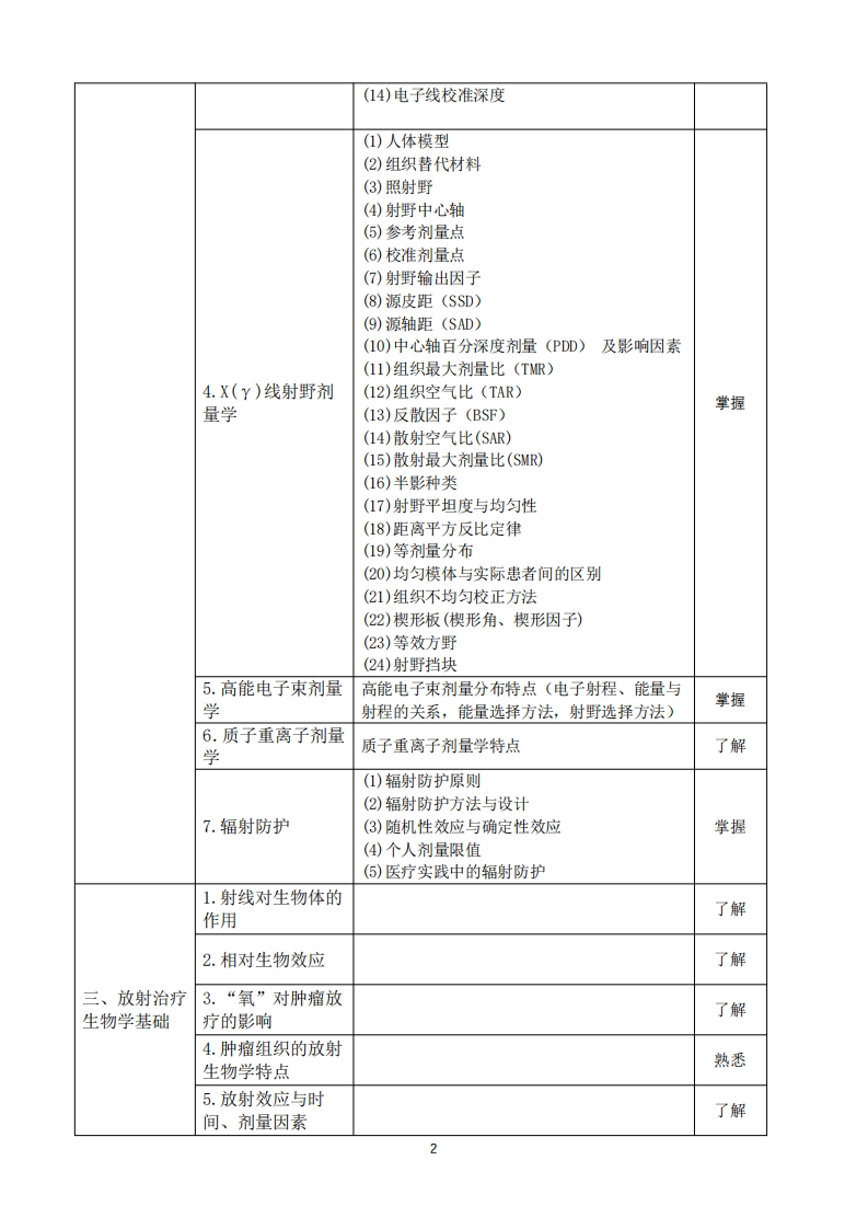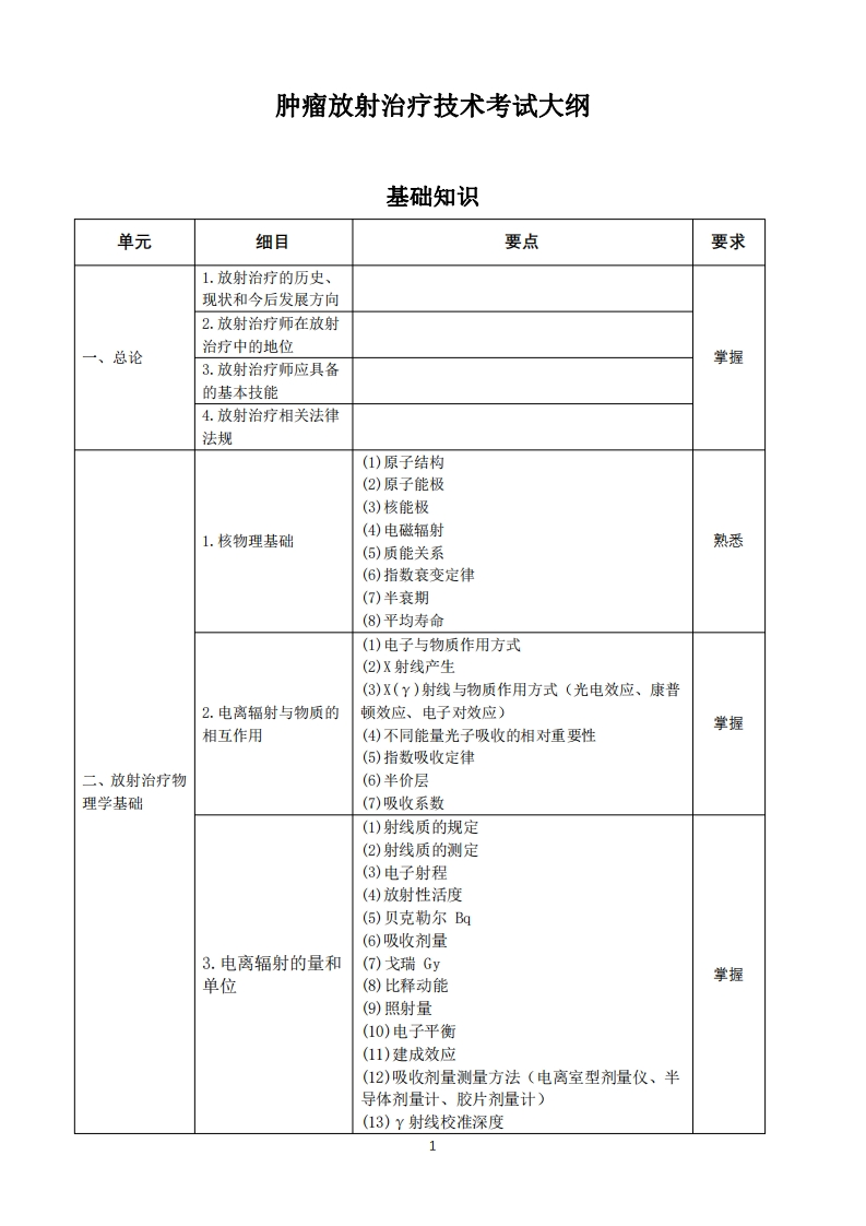 肿瘤放射治疗技术考试大纲基础知识单元细目要点要求1.放射治疗的历史、现状和今后发展方向2.放射治疗师在放射一、总论治疗中的地位掌握3.放射治疗师应具备的基本技能4.放射治疗相关法律法规(1)原子结构(2)原子能极(3)核能极(4)电磁辐射1.核物理基础熟悉(⑤)质能关系(6)指数衰变定律(7)半衰期(8)平均寿命(1)电子与物质作用方式(2)X射线产生(3)X(Y)射线与物质作用方式(光电效应、康普2.电离辐射与物质的顿效应、电子对效应)掌握相互作用(4)不同能量光子吸收的相对重要性(⑤)指数吸收定律二、放射治疗物(6)半价层理学基础(7)吸收系数(1)射线质的规定(2)射线质的测定(3)电子射程(4)放射性活度(5)贝克勒尔Bq(6)吸收剂量3.电离辐射的量和(7)戈瑞Gy掌握单位(⑧)比释动能(9)照射量(10)电子平衡(11)建成效应(12)吸收剂量测量方法(电离室型剂量仪、半导体剂量计、胶片剂量计)(13)Y射线校准深度1