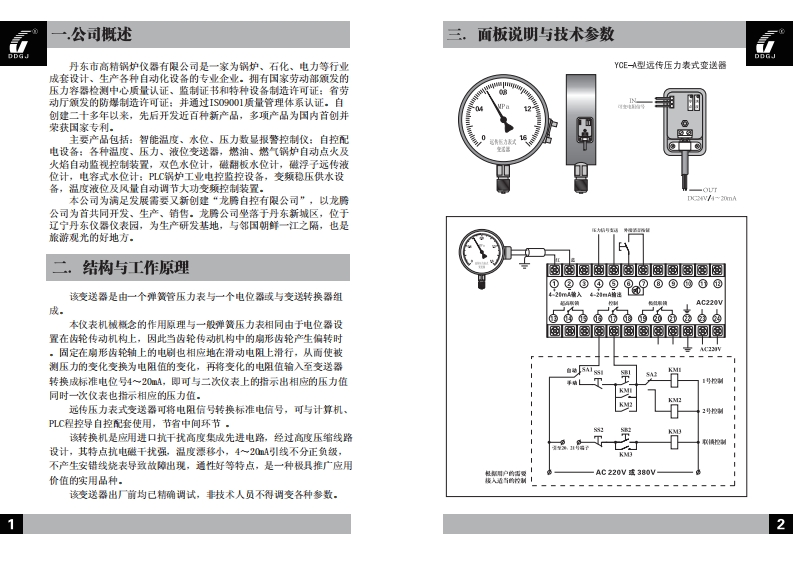 安装使用手册DDGJINSTALLATION SPECIFICATIONYCE-A型远传压力表式变送器25丹东市高精锅炉仪器有限公司监制丹东龙誉自控有根公可制造地址:丹东市江城大街267-3号地址:丹东市新城区仪表园12号6层3编:1180013编:118001电话:0415-2851752电话:0415-6123039传慎0415-2819283传慎0415-6123029技术:13942590613郎箱:lanyi6666@163.c0m网t站:www.ddgaojing.com可站www.ddltzk.com开户:招两银行丹东市支行开戶:农业银行丹东玩兴支行账号:135582523310001账号:06-518101040012743税号21060274714669X税号:210603692692617丹东龙腾自控有限公司DAN DONG DRAGON AOTO-CONTRAL CO.,LTD.