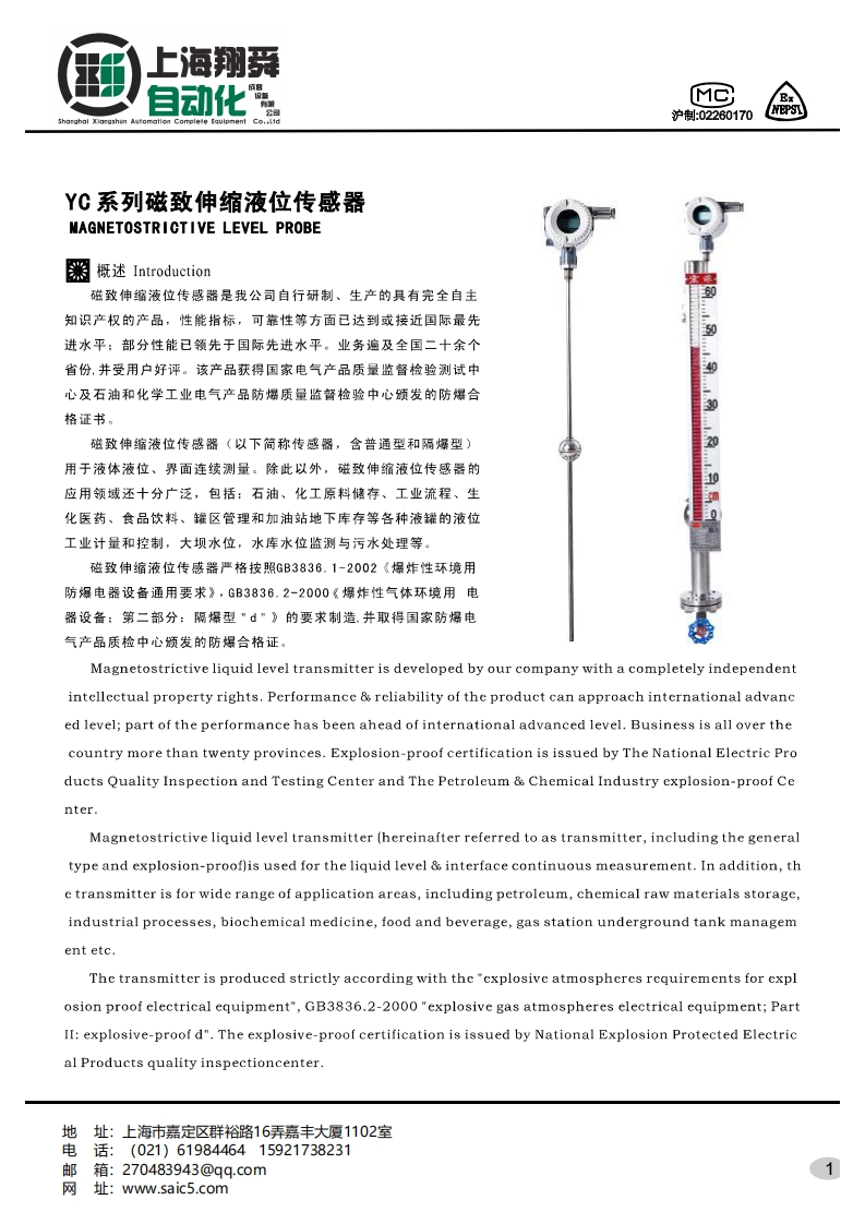 YC磁致伸缩液位计说明书348072@abc6个月前发布关注私信1.19MB6页045YC磁致伸缩液位计说明书此内容为付费资源,请付费后查看¥22¥33黄金会员免费钻石会员免费立即购买您当前未登录!建议登陆后购买,可保存购买订单付费资源 第1页 / 共6页 第2页 / 共6页 试读已结束,还剩4页,您可下载完整版后进行离线阅读 THE END说明书手册 文本预览 YC系列磁致伸缩液位计用户手册上海翔舜自动化成套设备有限公司 查看更多 收起部分 喜欢就支持一下吧收藏