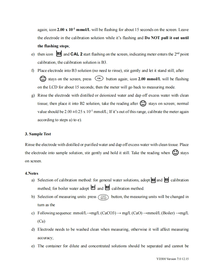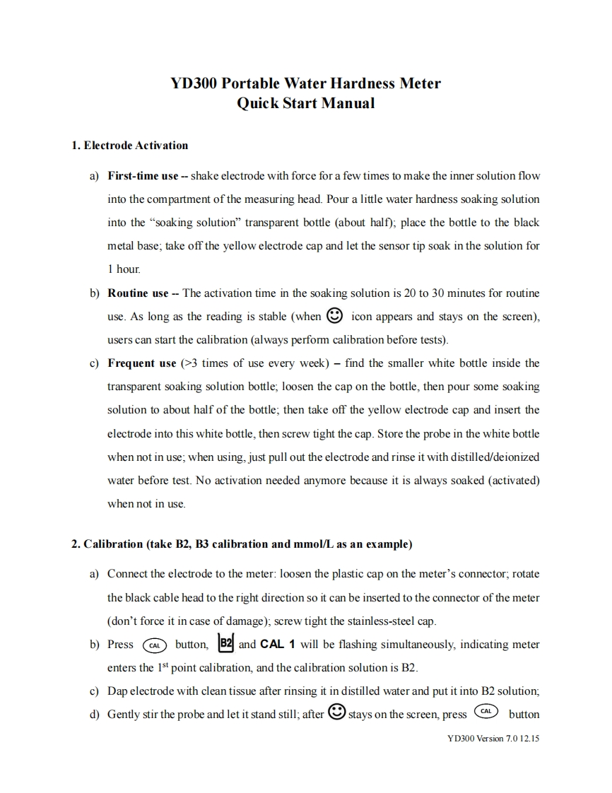 YD300 Portable Water Hardness MeterQuick Start Manual1.Electrode Activationa)First-time use--shake electrode with force for a few times to make the inner solution flowinto the compartment of the measuring head.Pour a little water hardness soaking solutioninto the "soaking solution"transparent bottle (about half);place the bottle to the blackmetal base;take off the yellow electrode cap and let the sensor tip soak in the solution for1 hour.b)Routine use--The activation time in the soaking solution is 20 to 30 minutes for routineuse.As long as the reading is stable (when icon appears and stays on the screen),users can start the calibration (always perform calibration before tests).c)Frequent use (>3 times of use every week)-find the smaller white bottle inside thetransparent soaking solution bottle;loosen the cap on the bottle,then pour some soakingsolution to about half of the bottle;then take off the yellow electrode cap and insert theelectrode into this white bottle,then screw tight the cap.Store the probe in the white bottlewhen not in use;when using,just pull out the electrode and rinse it with distilled/deionizedwater before test.No activation needed anymore because it is always soaked (activated)when not in use.2.Calibration (take B2,B3 calibration and mmol/L as an example)a)Connect the electrode to the meter:loosen the plastic cap on the meter's connector;rotatethe black cable head to the right direction so it can be inserted to the connector of the meter(don't force it in case of damage);screw tight the stainless-steel cap.b)Press (cAL)button,B2 and CAL1 will be flashing simultaneously,indicating meterenters the lst point calibration,and the calibration solution is B2c)Dap electrode with clean tissue after rinsing it in distilled water and put it into B2 solution;d)Gently stir the probe and let it stand still:afterstayson the screen,press(CALbuttonYD300 Version 7.0 12.15