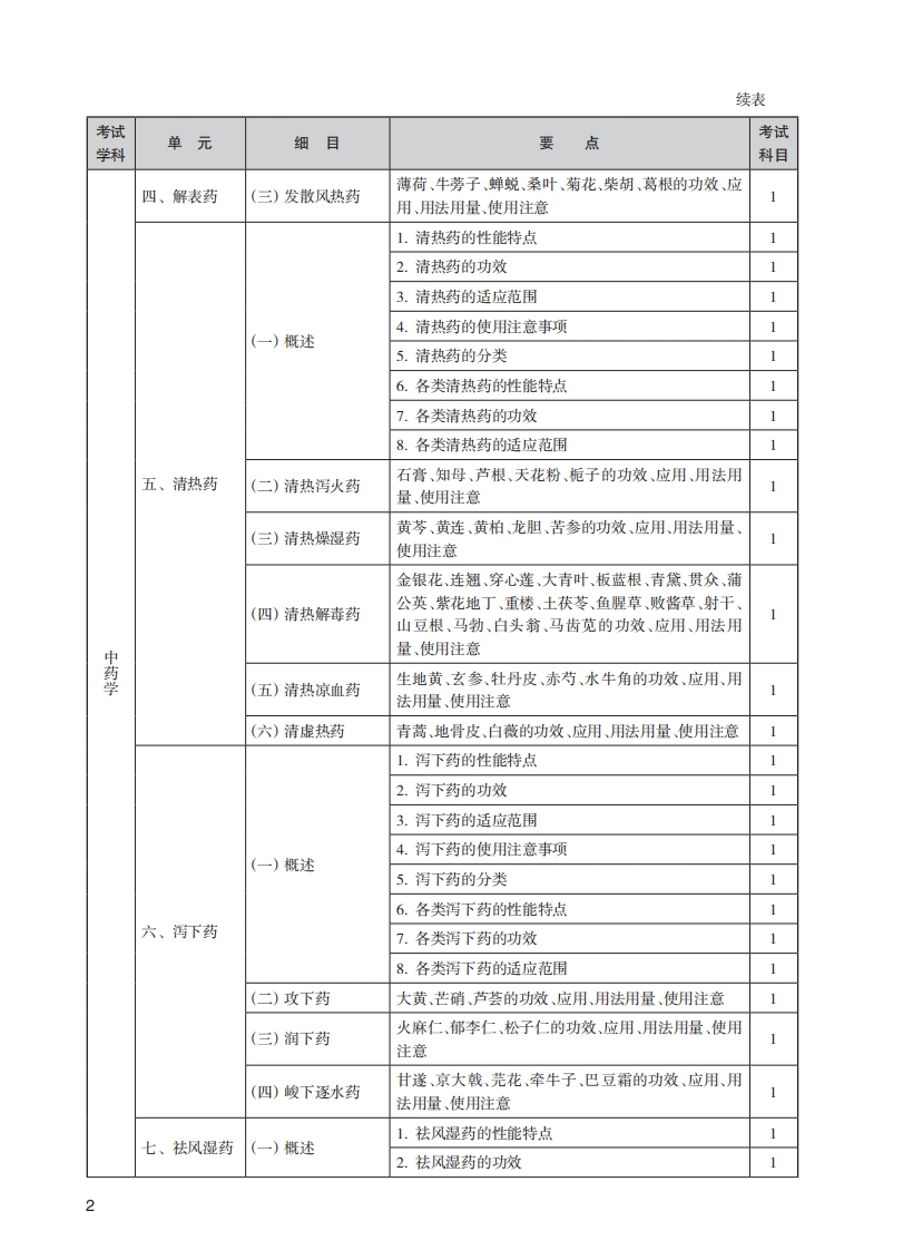 中药学(士)专业技术资格考试大纲第一部分基础知识考试学科单元细目要点考试科目1.四气所表示药物的作用1(一)四气2.四气对临床用药的指导意义1(二)五味五味所表示药物的作用11.影响升降浮沉的因素1(三)升降浮沉2.升降浮沉对临床用药的指导意义1一、药性理论1.归经的理论基础和依据1(四)归经2.归经理论对临床用药的指导意义1.毒性的含义1(五)毒性2.正确对待中药的毒性13.引起中药中毒的主要原因11.配伍的意义1(一)中药的配伍2.配伍的内容1二、中药的配1.配伍禁忌伍与用药禁忌1(二)中药的用药禁忌2.妊娠用药禁忌1辜3.服药时的饮食禁忌1(一)剂量确定剂量的因素1三、中药的剂1.特殊煎法1量与用法(二)用法2.服药法11.解表药的性能特点12.解表药的功效13.解表药的适应范围14.解表药的使用注意事项1(一)概述四、解表药5.解表药的分类6.各类解表药的性能特点17.各类解表药的功效18.各类解表药的适应范围1(二)发散风寒药麻黄、桂枝、紫苏、荆芥、防风、羌活、白芷、细辛的功效、应用、用法用量、使用注意1