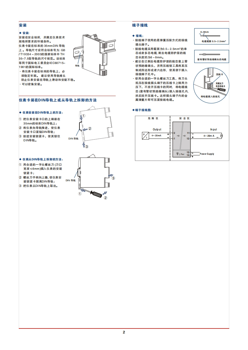 使用说明书UDIAN厦门宇电自动化科技有限公司YD5045直流信号输出隔离安全栅注意事项:·此仪表属于“本安型”电气设备,安装在安全场所。·安装、电气连接和操作应该由有电工技术资质的专业人员进行。Ex请遵守所述的安装方面的要求。请遵守相应的规章及安全规定、以及技术方面的常规守则。技术数据请参阅本使用说明书。禁止对仪表内部的电路进行任何修改,不得擅自维修该仪表。只能用一个同类攸表替换,只有制造商才可以执行维修操作。该仪表防护等级为1P20(IEC60529/EN60529),适合在清洁、干燥的环境内使用。不要给设备施加超过其设计能力的负荷。在本安侧进行测量时。必须遵守连接本安型电气设备的相关规定。在本安电路内只能使用允许用于此类电路的设备。主要技术参数只有在仪表断电的状态下,才允许进行安装或拆卸、连接或者断开接线。·如果出现仪表损坏、不当负荷威者功能故障时,要将仪表停机,◆输入并立即撒出。输入信号:4-20mA输入阻抗:24Ω输入压降:20mA时,<4V◆输出(本安】输出电流信号:4~20mA电流输出负载:写5500(出厂默认)输出纹波:<10mVp-p概述◆供电电源,接受来自安全区的DCS/PLC系统或其它操作器的直流电流4-20mA信供电电压范围:20-30VDC号,经安全栅隔离传送,输出直流电流4~20mA信号。驱动处于危脸额定供电电压:24VDC现场的电气转换器、阀门定位器、LED显示等设备。电流消耗(24VDC供电时】:<30mA单通道,一路输入,一路输出。直流电源供电方式,供电电源一输入一输出之间隔离。◆综合参数采用标准的35 mmDIN导轨卡式安装。可拔插的接线插头端子,弹簧压景标准精度:±0,1%连接。温度漂移:±0.015%/℃响应时间:<10ms隔离能力:输入-输出-电源之间2.5KV.1mln,50Hz绝缘电阻:输入-输出-电源之间≥100MQ/500VDC工作环境温度:-20~+60℃仪表外形结构·尺寸储存环境温度:-40-+80℃环境湿度范围:5-95%RH(无冷凝)电碰兼客性:符合89/336/EEC,IEC/EN61000相关要求机壳材质:PC(聚碳酸脂)材料防护等级:1P20外形尺寸:16×116×110(mm]@整机重量:钧110g-120g适用于连接的现场设备:御门定位器,电气转换器等本安设岛设备允许所处危险区域:0区、1区、2区:1A、B、IC。◆安全防烟认证参数防爆等级标志:[Exia Ga]lIc单位安全认证参数:Um:250VAC/DC①仪表而板5仪表壳体Uo:24VDC lo:152mAPo:0.91W②本安侧接线插头端子蓝色)6产品标签粘贴部位Lo:1.0 mHC0:0.08uF3非本安侧接线插头端子(绿色)⑦导轨安装卡口④电源接线插头端子B导轨安装锁景卡1