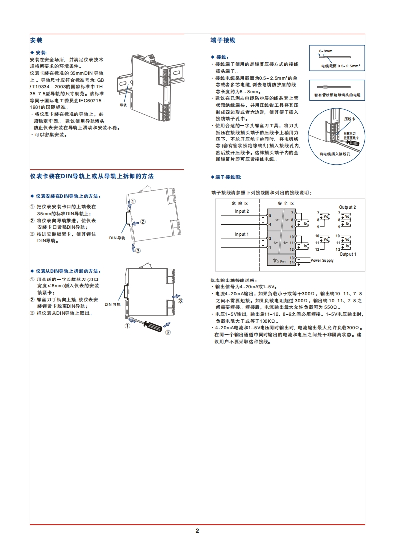 使用说明书●●UDIAN厦门宇电自动化科技有限公司YD5054直流信号输入隔离安全栅注意事项:·此仪表属于“本安型”电气设备,安装在安全场所。·安装、电气递接和操作应该由有电工技术资质的专业人员进行」请遵守所述的安装方面的要求。请遵守相应的规章及安全规定、以及技术方面的常规守则。技术数据请参阅本使用说明书。禁止对仪表内部的电路进行任何修改不得檀自维修该仪表。只能用一个同类位表替换,只有制造商才可以执行维修操作。该仪表防护等级为1P20(IEC60529/EN60529),适合在清洁、干燥的环境内使用。不要给设备施加超过其设计能力的负荷。主要技术参数在本安侧进行测量时,必须罐守连接本安型电气设备的相关规定。在本安电路内只能使用允许用于此类电路的设备。只有在仪表断电的状态下,才允许进行安装或拆卸、蓬接或者断开◆输入〔本安)接线。两路通道输入·如果出现仪表损坏、不当负荷或者功能故章时,要将仪表停机输入信号:4-20mA.1-5V,其它指定信号并立即撤出。(以订货时选定的为准,请参见仪表标整或机壳上印制的数据)输入阻抗:电流输入时24Ω;电压输入时≥500KQ◆输出两路通道输出以订货时选定的为准,请参见权表标竖或机壳上印制的数糊负载电阻:电流4-20mA输出时,≤350Q(出厂默认)概述电压1-5V输出时,100KQ输出纹被:<10mVp-p·适用于连接安装在现场危险区域的直流信号源设备。接受直流信号输入◆供电电源经过隔离、干扰抑制等处理后,向安全区的控制系统或其它仪表输出直供电电压范田:20~30VDC流信号。额定供电电压:24VDC·双通道,两路输入,两路输出。直流电源供电方式,供电电源一输入一电流消耗:<50mA(24VDC供电)输出各通道之间隔离。·采用标准的35 mmDIN导轨卡式安装。可拔插的接线插头端子,弹簧压景◆综合参数连接。标准精度:±0.1%可以与各种攸表及DCS、PLC等系统配合使用。温度漂移:±0.015%/℃响应时问:<10ms隔离能力:输入-输出-电源之间2.5KV.1min,50Hz绝缘电阻:输入-输出-电源之间3100MQ/500VDC工作环境温度:-20-+60℃储存环境温度:-40。+80℃环境湿度范田:5~95%RH(无冷凝)仪表外形结构·尺寸电磁兼客性:符合89/336/EEC,IEC/EN61000相关要求机壳材质:PC(聚碳酸脂)材料防护等级:1P20外形尺寸:16×116×110(mm】整机重量:约110g~120g适用于连接的现场设备:各种直流信号源设备设备允许所处意险区域:0区、1区、2区:川A、川B、川C。◆安全防烟认证参数防爆等级标志:[Exia Ga]l IC安全认证参数:Um:250VAC/DC单位:mmUo:7.2VDClo:3.6mAPo:7mWLo:2.4 mHCo:4uF①仪表面板5仪表壳体2本安侧接线插头端子蓝色)6产品标签粘贴部位③非本安侧接线插头端子(绿色)⑦导轨安装卡口④电源接线插头端子⑧导轨安装锁景卡1