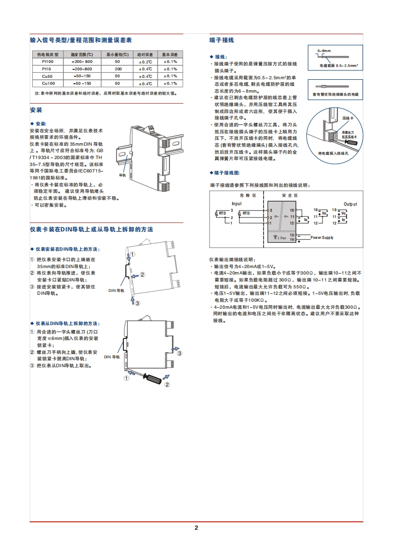 使用说明书”ヅUDIAN圆门字电自动化科技有限公司YD5082热电阻输入,温度变送隔离安全栅注意事项:·此仪表属干“本安型”电气设备,安装在安全场所。Ex,安装、电气连接和操作应该由有电工技术资质的专业人员进行。请遵守所迷的安装方面的要求。请遵守相应的规章及安全规定、以及技术方面的常规守则。技术数据请参阅本使用说明书。,禁止对仪表内部的电路进行任何修改,不得擅自雏修该仪表。只能用一个同类仪表替换,只有制造商才可以执行维修操作。该仪表防护等级为1P200EC60529/EN60529),适合在清洁、干燥的环境内使用。不要给设备施加超过其设计能力的负荷。主要技术参数在本安侧进行测量时,必须遵守莲接本安型电气设备的相关规定。在本安电路内只能使用允许用于此类电路的设备。◆输入【本安刻,只有在仪表断电的状态下,才允许进行安装或拆卸、连接或者断开输入信号类型:Pt100、Pt10、Cu50、Cu100热电阻接线。测量范围:取决干所用传感器类型·如果出现仪表损坏、不当负荷或者功能故障时,要将仪表停机,传感器接线:二线制或三线制并立即撒出。导线电阻:每根导线写10Q(输入信号类型和测量范因以用户订货时霜定的为准,详见仪表标签或机壳上印制的数)◆输出输出信号:4-20mA,1-5V,或其它指定信号概述(以订货时选定的为准,请参见仪表标签或机壳上印制的数)负载电阻:电流4-20mA输出时,≤3500(出厂默认)电压1-5V输出时,≥100K0,适用干现场危险区域的热电阻信号输入,经过隔离,转换为标准的直流输出纹波:<10mVp-p信号输出到安全区的控制系统或其它仪表。单通道,一路输入,一路输出。直流电源供电方式,供电电源一输入一◆供电电源输出之问隔离。供电电压范围:20-30VDC采用标准的35 mmDINS导轨卡式安装。可拔插的接线插头端子,弹簧压紧额定供电电压:24VDC莲接。电流消耗24VDC供电):<25mA可以与DCS、PLC等系统或其它仪表配套使用,广泛用于工业生产过程的各种温度检测和控制系统。◆综合参数标准精度:±0.1%(参见输入信号类型/量程范国和测量误差表)温度漂移:基本误差/10℃响应时间:<10ms仪表外形结构·尺寸隔离能力:输入-输出-电源之间2.5V,1min,50Hz绝缘电阻:输入-输出-电源之问≥100M0/500VDC工作环境温度:-20-+60℃储存环境温度:-40-+80℃环境湿度范围:5-95%RH(无冷凝】电磁兼客性:符合89/336/EEC,IEC/EN61000相关要求机壳材质:PC(聚碳酸脂材料防护等级:1P20外形尺寸:16×116×110(mm】整机重量:约110g-120g110适用于违接的现场设备:Pt100、Cu50等热电阻温度传感器单位:m可设备允许所处危险区域:0区、1区、2区;A、1B、C。①仪表面板⑤仪表壳体◆安全防爆认证参数②本安侧接线插头端子蓝色)6产品标签粘贴部位防想等级标志:【Exia Ga]IIC3非本安侧接线插头端子绿色))导轨安装卡口安全认证参数:Um:250VAC/DC④电源接线辐头端子⑧导轨安装锁紧卡Uo:7.2VDC lo:93mAPo:0.17WLo:2.4 mH Co:4uF1