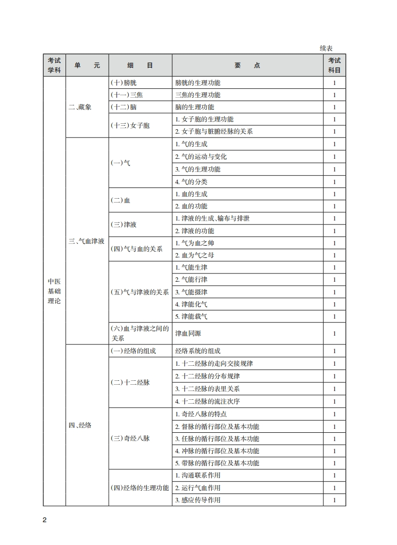 全科医学(中医类/中级)专业技术资格考试大纲第一部分基础知识考试单元考试学科细目要点科目L.阴阳交感12.阴阳对立1(一)阴阳学说的基本3.阴阳互根内容4.阴阳消长15.阴阳转化16.阴阳自和1一、阴阳五行(二)阴阳学说在中医1.说明人体的生理病理变化1学说学中的应用2.指导疾病的诊治1(三)五行学说的基本1.五行生克制化1内容2.五行生克异常11.构建天人一体的五脏系统1(四)五行学说在中医学中的应用2.说明五脏病变的相互影响中医3.指导疾病的诊治1基础L.生理功能1理论(一)心2.与形、窍、志、液、时的系统联系11.生理功能1(二)肺2.与形、窍、志、液、时的系统联系L.生理功能1(三)脾2.与形、窍、志、液、时的系统联系1L.生理功能1二藏象(四)肝2.与形、窍、志、液、时的系统联系1L.生理功能(五)肾2.与形、窍、志、液、时的系统联系(六)胆胆的生理功能1(七)胃胃的生理功能1(八)小肠小肠的生理功能1(九)大肠大肠的生理功能11