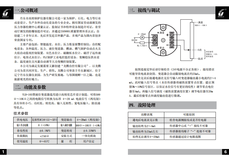 安装使用手册DDGJINSTALLATION SPECIFICATIONYLB-105型液位变送器重性丹东市高猜锅炉仪器有限公司监制丹东龙誉自控有根公可制造地址:丹东市江城大街267-3号地址:丹东市新城区仪表园12号6层3编:1180013编:118001电话:0415-2851752电话:0415-6123039传慎0415-2819283传▣0415-6123029技术:13942590613部箱:lanyi6666@163.c0m网t站:www.ddgaojing.com可站www.ddltzk.com开户:招两银行丹东市支行开戶:农业银行丹东玩兴支行账号:135582523310001账号:06-518101040012743税号21060274714669X税号:210603692692617丹东龙腾自控有限公司DAN DONG DRAGON AOTO-CONTRAL CO.,LTD.