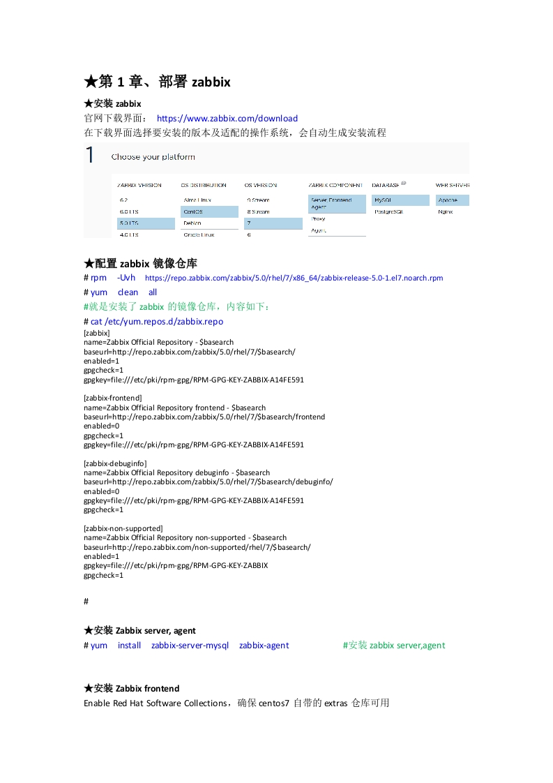 zabbix安装及使用前言:1.蓝色字体表示命令行命令,正式执行时不要复制前面的#号,#号只是命令提示符2.绿色字体表示注释,有时注释太多就不用绿色表示了3.注意:本文档的所有操作请先在测环境进行实践,请不要直接在真实的服务器中操作!版权声明:本文档以开源的形式发布,所有条款如下:1.无担保:作者不保证文档内容的准确无误,亦不承担由于使用此文档所导致的任何后果2.自由使用:任何人可以出于任何目的而自由地阅读/链接/打印/转载/引用/再创作此文档,无需任何附加条件若您阅读/链接/打印/转载/引用/再创作本文档,则说明接受以上2个条款。作者:李茂福更新日期:2023-08-28