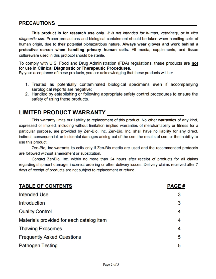zenbioHuman Exosome Care ManualINSTRUCTION MANUAL ZBM0091.02SHIPPING CONDITIONSHuman ExosomesOrders are delivered via Federal Express courier.All US and Canada orders are shipped viaFederal Express Priority service and are usually received the next day.International orders areusually received in 3-4 days.Alternate couriers are available for shipment.Please inquire if needed.Must be processed upon shipment receipt.STORAGE CONDITIONSHuman Exosomes are to be stored at-80C immediately upon arrival.All Zen-Bio Inc products are for research uses only.Not approved for human orveterinary use or for use in diagnostic or clinical procedures.Not for use in humans.ORDERING INFORMATION AND TECHNICAL SERVICESZenBio,Inc.3200 East NC-54 Suite 100P0B0x13888Research Triangle Park,NC 27709U.S.A.Telephone1-(919)547-0692Facsimile(FAX)1-(919)547-0693Toll free(continental US only)1-866-AD1P0SE1-(866)-234-7673Electronic mail (e-mail)information@zenbio.comWorld Wide Webhttp://www.zen-bio.comTHIS MANUAL IS SUITABLE FOR USE WITH THE FOLLOWING PRODUCTS:EXP-F100HUMAN PREADIPOCYTE EXOSOMES,1 BILLION PARTICLES/VIALEXPLMSC-F100HUMAN PLACENTAL MESENCHYMAL STEM CELL EXOSOMES,1 BILLION PARTICLES/VIALEXCBS-F100HUMAN CORD BLOOD SERUM EXOSOMES,>1 BILLION PARTICLES/VIALPage 1 of 5
