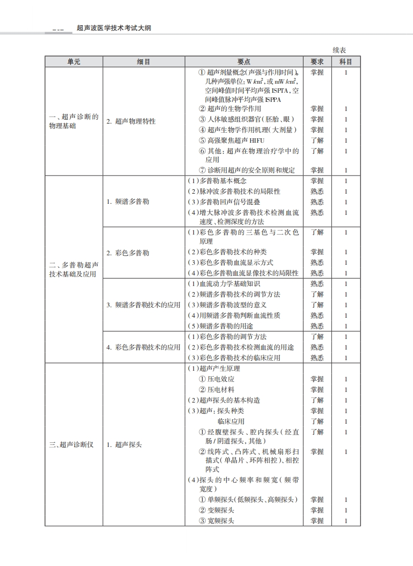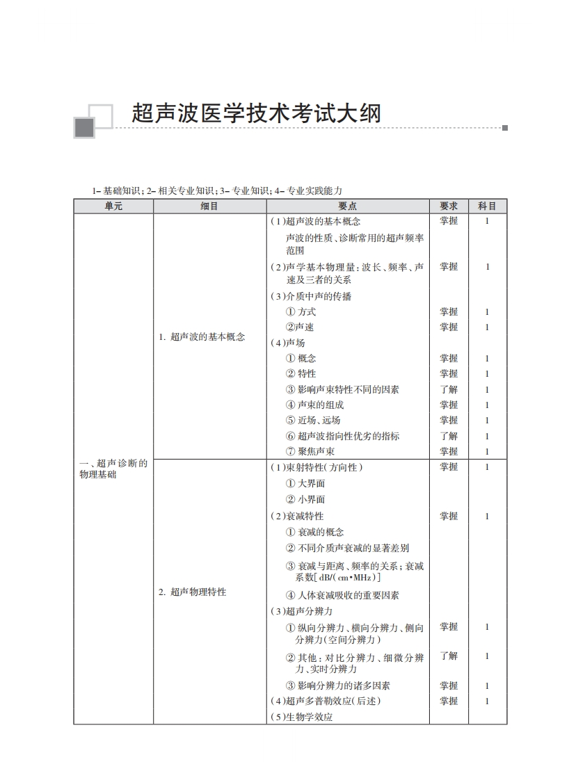 超声波医学技术考试大纲1-基础知识;2-相关专业知识;3-专业知识:4-专业实践能力单元细目要点要求科目(1)超声波的基本概念掌握1声波的性质、诊断常用的超声频率范围(2)声学基本物理量:波长、频率、声掌握速及三者的关系(3)介质中声的传播①方式掌握②声速掌握1.超声波的基本概念(4)声场①概念掌握②特性掌握③影响声束特性不同的因素了解④声束的组成掌握⑤近场、远场掌握⑥超声波指向性优劣的指标了解⑦聚焦声束掌握一、超声诊断的学握物理基础(1)束射特性(方向性)①大界面②小界面(2)衰减特性掌握1①衰减的概念②不同介质声衰减的显著差别③衰减与距离、颜率的关系;衰减系数[dB/(am·MHz)]2.超声物理特性④人体衰减吸收的重要因素(3)超声分辨力①纵向分辨力、横向分辨力、侧向掌握1分辨力(空间分辨力)②其他:对比分辨力、细微分辨了解力、实时分辨力③影响分辨力的诸多因素掌握(4)超声多普勒效应(后述)掌握(5)生物学效应