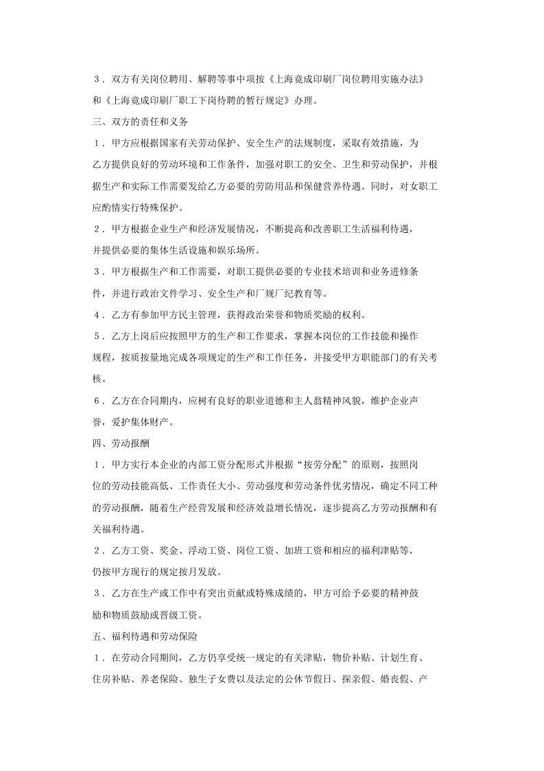 全员劳动合同书全员劳动合同书合同编号甲方:乙方:单位名称:姓名:法定代表人:性别:委托代理人:出生年月:厂址:家庭住址:所属区:根据《上海竞成印刷厂实行全员劳动合同制暂行规定》(以下简称《暂行规定》)和上海市劳动局《本市全民所有制企业实行全员劳动合同制试行办法》的有关规定:在平等自愿、协商一致的原则下,双方订立合同如下:一、合同类别和合同期限1,有固定期合同履行期限为年。自年月日起,至年月日止,其中试用期为个月(自一九年月日至一九年月日止):乙方必须为甲方服务期限为年(自一九年月日至一九年月日止)。合同期满应即终止,如甲方工作(生产)需要在双方同意的条件下,应即续订合同。2、无固定期劳动合同自年月日起,直至《暂行规定》中约定的条款发生时自行终止。其中乙方必须为甲方服务期限为年(自一九年月日至一九年月日止)。二、工作岗位1,甲方根据生产和工作的需要,并参照乙方的工作技能或特长,经考核后择优上岗或安排适当的工作。上岗前应按照《上海竞成印刷厂岗位聘用实施办法》与所在部门签订上岗聘约。上岗聘约为本合同附件。2,甲方因生产和工作需要或根据乙方的工作能力和表现情况,可调动乙方的工作部门工作岗位,在征求乙方意见时,如无特殊情况,乙方应以服从为原则。