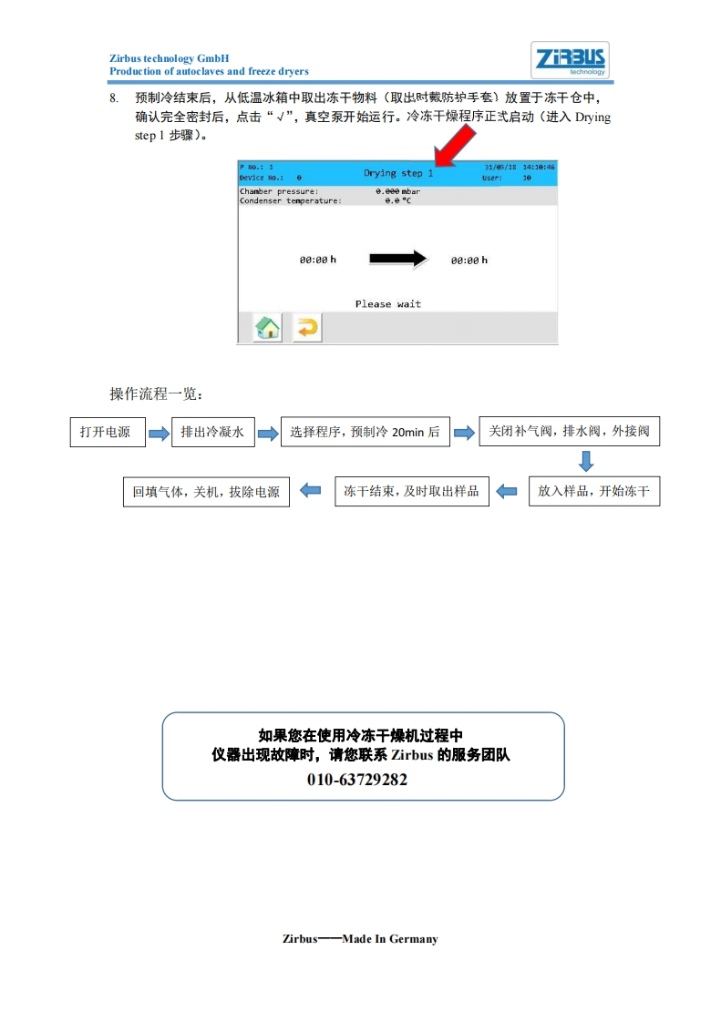Zirbus technology GmbHZiRBUSProduction of autoclaves and freeze dryerstechnologyZirbus实验室型冷冻干燥机(客户简略中文版使用手册)★在您运行冻干机之前,请您确认已经完成以下操作:1.您需要冷冻干燥的产品已经完成预冻。如果您冷冻干燥的产品以水作为溶剂,请至少保证在-50℃以下的温度预冻已超过4小时(放入-86℃超低温冰箱预冻更好,您取出冻干物料时,一定戴好防护手套,防止皮肤被冻伤)。2.检查真空泵和冷冻干燥机连接的真空管道与卡箍已经有效连接。3.用干燥洁净抹布擦拭冷阱,确保冷阱无异物和水;清洁冻干仓与底板和顶部盖子连接处;关闭冻干仓外接阀和朴气阀以及排水阀。4.打开排水阀。确认冻王机排水管道内无冷源水排出,然后喜紧排水堵头。5.通过观察真空泵视镜窗,查看真空泵油位是否处于最大刻度线与最小刻度线之间,且油是否澄清,清澈。★运行Zirbus冷冻干燥机6.选择相应的程序,如P1,P2,P3。输入密码后,确认相应的参数已经设置,如每步的时间,压力(选配件)。ogram select/05/1第12:37:15user:P1Total throughput time:00:00P2Tota】throughput time:e:阿p3Total throughput time::7.切换至主界面,点击“precooling”,此时预制冷启动(预制冷一般为10分钟)使冻干机制冷至最低相应温度如(-50℃,-80℃)。Po.:331/85/1814:81:52Device Ho.:eOverviewUser:Step Time:100:00 h208:00h3e0:00hPrecoolingStart编辑程序XZirbus-Made In Germany