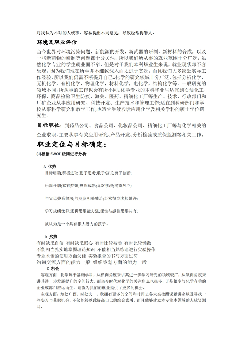 《个人职业生涯规划书》(一)自我评估性格特征:求知欲强,知识渊博,有学识才能,但较不喜欢领导和竞争:个性独立、温和、谨慎、保守、内向。情绪稳定,忍耐力强,给人的印象是诚实、谦和、节俭、脚踏实地。个性温暖、友善,乐于助人,善言谈,能与周围的人融洽的相处,令人信服喜欢从事与人接触的活动,关心人胜于关心物。职业兴趣:更倾向于从事研究型、实际型和社会型的职业。可以优先考虑的职业:临床研究员、软件工程师、电子技术研发工程师、课程设计与开发人员录音师、建筑制图员/制图员、厨师、水利水电建筑工程师、水处理工程师、硬件工程师大学教师、中学教师、小学教师、,心理咨询师、客户关系管理员、公务员、外科医生、护士、高校辅导员职业价值观:最看重的三种职业价值要素为创造发明、独立自主和智力激发1)看重创造发明:希望能在工作中不断创造新的东西,或产生新的想法。2)看重独立自主:希望能在工作中充分发挥自己的独立性和主动性,按自己的方式、步调或想法去做,不受他人的干扰。3)看重智力激发:希望能在工作中不断进行智力的操作,动脑思考,学习和探索新事物,解决问题。技能和能力能力:随机应变的能力,自我控制的能力,调节情绪的能力,自我思考的能力,调研时间的能力,坚持学习的能力。技能:能够深入的了解excel,word和powerpoint的使用。具有一定的情商处理人际关系。综合的优势和劣势:优点:1、做人真诚,做事认真负责。2、喜欢与人交往,善于组织策划活动和项目。3、积极务实,敢于主动承担自己的责任。4、能坚持。确定了正确方向,我就能把所有的力气砸向那个方向。有执行能力。5、勤奋,善于学习自己感兴趣的知识和事物。做事喜欢列个计划,分出轻重缓急。缺点:性格方面的弱点,有时给自己压力过大,急于求成,过犹不及。办事比较死板,有时容易和人较真。
