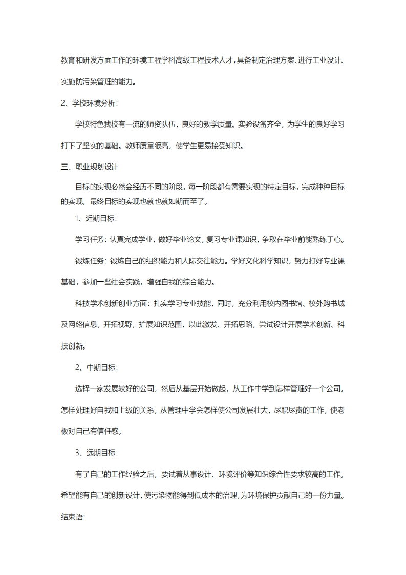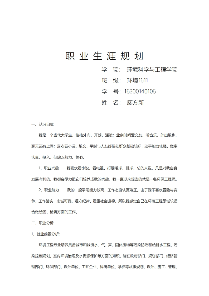 职业生涯规刻学院:环境科学与工程学院班级:环境1611学号:16200140106姓名:廖方新一、认识自我我是一个当代大学生,性格外向、开朗、活泼;业余时间爱交友、听音乐、外出散步聊天还有上网;喜欢看小说、散文,平时与人友好相处群众基础较效好,动手能力较强,做事认真、投入,但缺乏毅力、恒心。1、职业兴趣一我喜欢看小说,看电视、打羽毛球、排球,总的来说,凡是对我自身发展有利的,我都会尽力把它们培养成我的兴趣。我一直以来想当的就是一名环保工程师。2、职业能力一我的一般学习能力较高,工作态度认真端正。由于我不喜欢冒险与竞争、工作踏实,忠诚可靠,遵守纪律、看重社会道德。所以我感觉自己在环境工程领域较适合做绘图、检测方面的工作。二、职业分析1、就业前景分析:环境工程专业培养具备城市和城镇水、气、声、固体废物等污染防治和给排水工程、污染控制规划,室内环境治理及水资源保护等方面的知识,能在政府部门、规戏划部门、经济管理部门、环保部门、设计单位、工矿企业、科研单位、学校等从事规划、设计、施工、管理、
