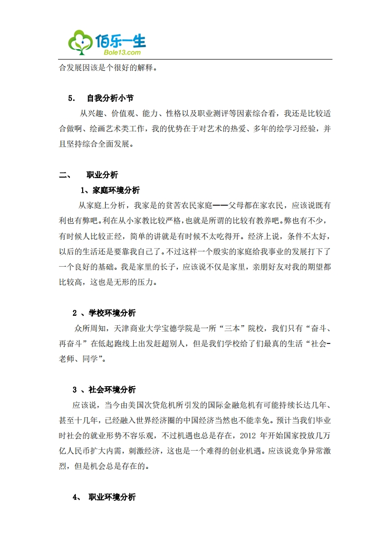 佰乐一生Bole13.com环境艺术设计专业大学生职业生涯规划书一、自我分析1.职业兴趣一喜欢干什么我个人职业兴趣方向,通俗一点说就是以扎实的艺术理论知识为基础向艺术绘画方面,也就是纯艺(绘画)方面发展。这也许与我之前的学习生活经历有关,我小学、初中、高中都是美术专业生。因此我对艺术方面的东西比较感兴趣,虽然大学选的是环境艺术设计,但未来的职业并只想在设计方面有所发展,我的兴趣在艺术行业管理以及艺术绘画方面,当然所有的艺术是通的,设计也是一门艺术。从小到大的绘画基础给我的综合发展打下良好的基础。2.职业价值观—一什么是我看重的我个人认为,对一个刚刚就业的大学生来说,一个职业或者职位是否适合自己,虽然薪酬是一个很重要的因素,不过更重要的是这个工作是否适合自己,是为是自己喜欢的,以及在未来的几年、十几年、甚至几十年里对自己来说是否有足够的发展潜力。3.职业能力—我能够干什么之前我说过,以扎实的艺术理论知识为基础向艺术绘画方面,也就是纯艺(绘画)方面发展。所以我对自己的职业能力定位要求较高,既要有丰富艺术理论知识,较深后的绘画经验,也要有较好的艺术表现手法。再通俗一点说,就是既能够犒一些研发工作,也能从事管理及艺术创作。4.性格特征一适合干什么如果从性格方面分析就比较简单了,人和人之间都是不一样的,没有任何两个人有完全相同的性格。不存在完全的外向也不存在完全的内向。这要看每个人对自我的认识了,我对自己的理解是一一内外双向。至于说我的这种性格到底该干什么工作,我个人认为以性格来决定行业选择是不可行的,性格是随着时间和环境不断变化的,只能作为参考。如果非要参考性格因素的话,我想我选择综