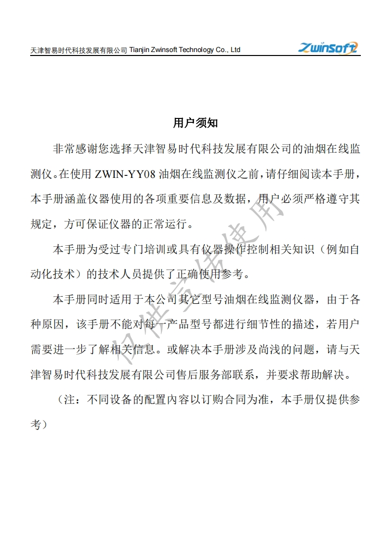 ZWIN-YY08油烟监测产品说明书348072@abc6个月前发布关注私信0.97MB24页023ZWIN-YY08油烟监测产品说明书此内容为付费资源,请付费后查看¥22¥33黄金会员免费钻石会员免费立即购买您当前未登录!建议登陆后购买,可保存购买订单付费资源 第1页 / 共24页 第2页 / 共24页 试读已结束,还剩22页,您可下载完整版后进行离线阅读 THE END说明书手册 文本预览 uinsof金R油烟在线监测仪ZWIN-YY08仅供产品说明书PRODUCT SPECIFICATION天津智易时代科技发展有限公司Tianjin Zwinsoft Technology Co.Ltd 查看更多 收起部分 喜欢就支持一下吧收藏