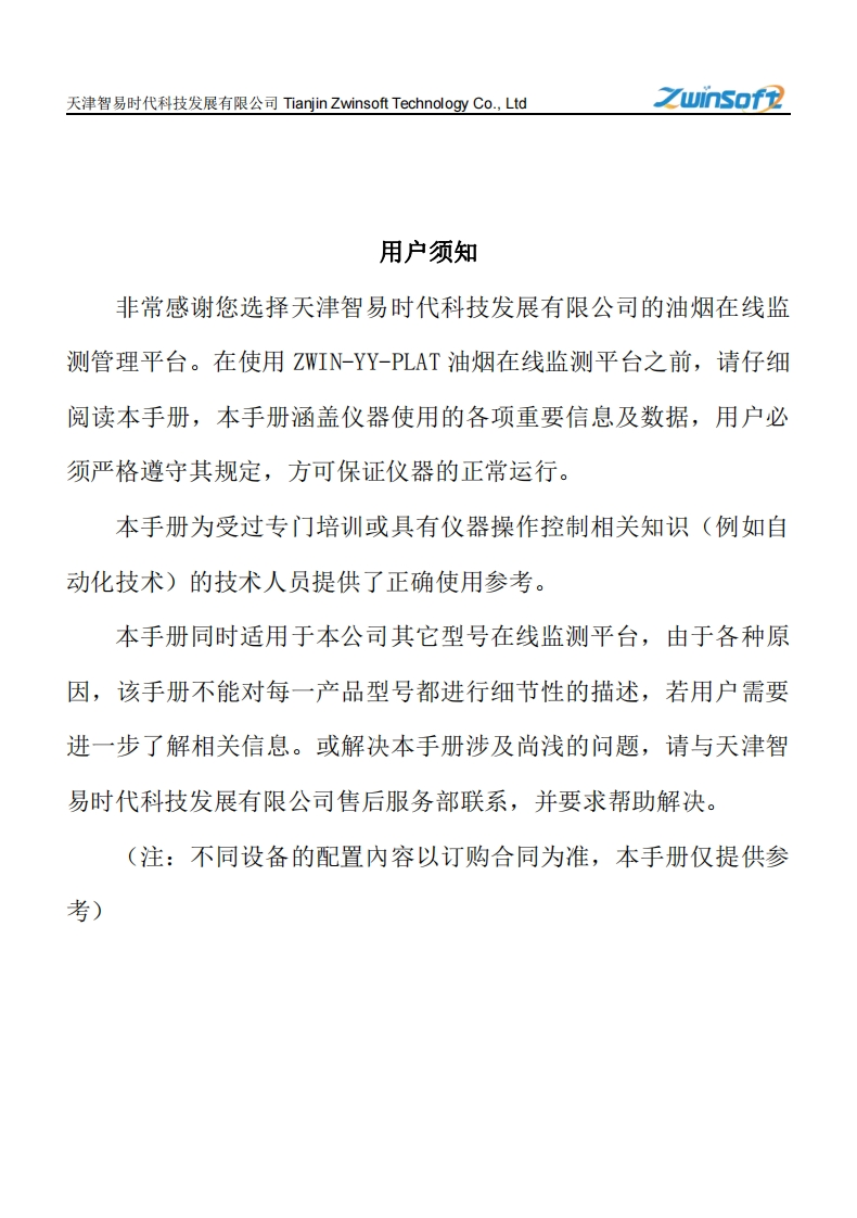 ZWIN-YY-PLAT油烟在线监测管理平台说明书(32开)(B版本)348072@abc6个月前发布关注私信2.06MB23页030ZWIN-YY-PLAT油烟在线监测管理平台说明书(32开)(B版本)此内容为付费资源,请付费后查看¥22¥33黄金会员免费钻石会员免费立即购买您当前未登录!建议登陆后购买,可保存购买订单付费资源 第1页 / 共23页 第2页 / 共23页 试读已结束,还剩21页,您可下载完整版后进行离线阅读 THE END说明书手册 文本预览 Zwinsof2且油烟在线监测平台ZWIN-YY-PLAT产品说明书PRODUCT SPECIFICATION天津智易时代科技发展有限公司Tianjin Zwinsoft Technology Co.Ltd 查看更多 收起部分 喜欢就支持一下吧收藏