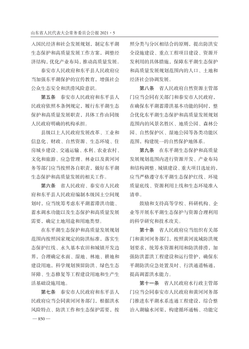 山东省东平湖保护条例2021年9月30日山东省第十三届人民代表大会常务委员会第三十次会议通过第一条为了加强东平湖生态保护和先、绿色发展、科学利用的原则,实行政修复,提高蓄水防洪能力,保障黄河防洪府主导、分级负责、部门联动、社会参与、安全和南水北调供水调水安全,推动经济流域管理与属地管理相结合的工作机制。社会高质量发展,根据有关法律、行政法第四条省人民政府应当建立健全规,结合本省实际,制定本条例。东平湖生态保护和高质量发展工作协调机第二条在省人民政府批准的东平湖制,编制东平湖生态保护和高质量发展专生态保护和高质量发展规划范围内,从事项规划,统筹解决东平湖生态修复、蓄水规划建设、保护利用、生产生活以及监督防洪、综合治理和区域经济社会发展中的管理等活动,应当遵守本条例。重大问题第三条东平湖生态保护和高质量发泰安市人民政府和东平县人民政府应展应当遵循防洪为主、保障供水、生态优当将东平湖生态保护和高质量发展工作纳-849—